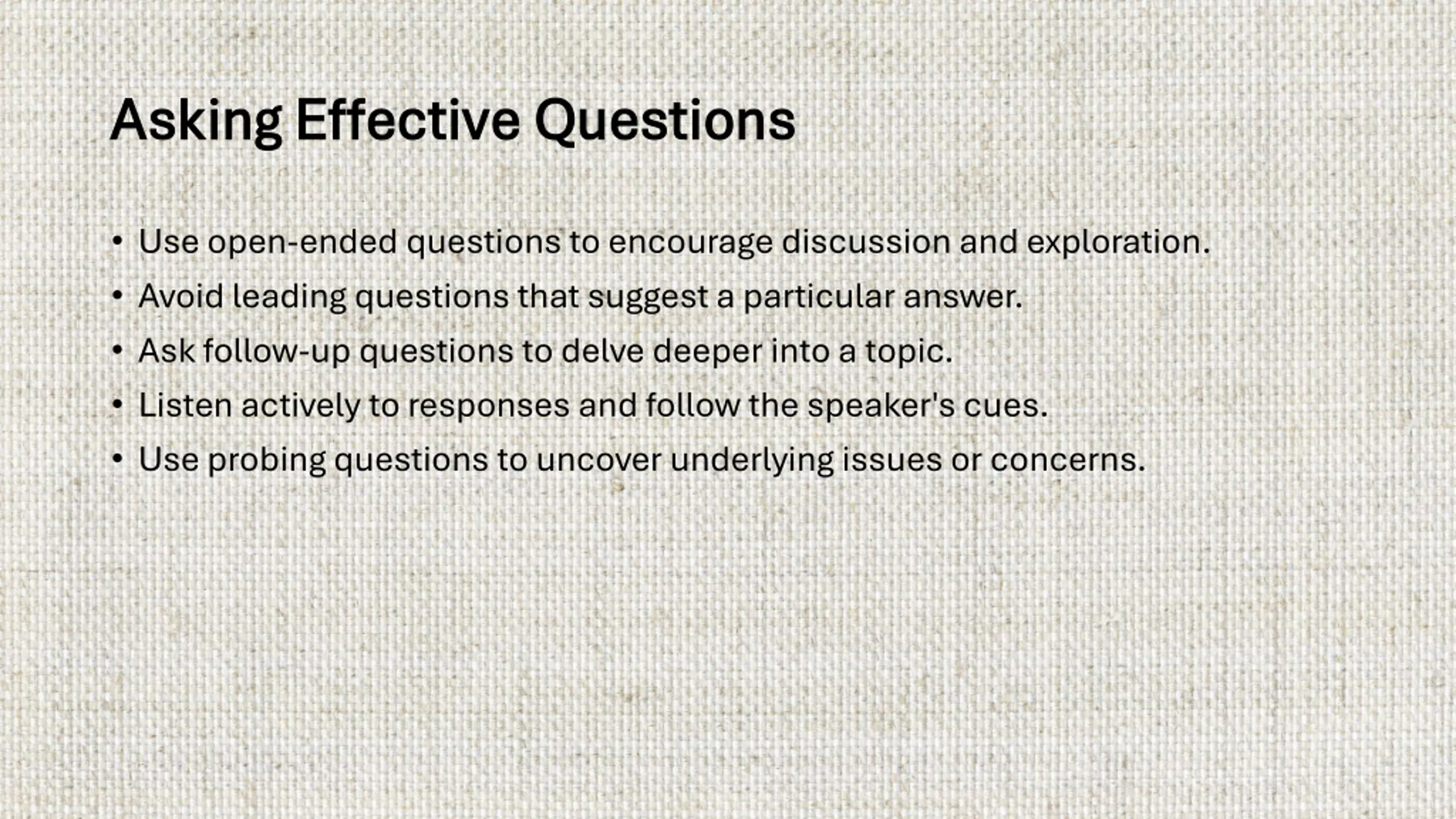 Asking Effective Questions Asking Effective Questions Use open-ended questions to encourage discussion and exploration. Avoid leading questions that suggest a particular answer. Ask follow-up questions to delve deeper into a topic. Listen actively to responses and follow the speaker's cues. Use probing questions to uncover underlying issues or concerns.