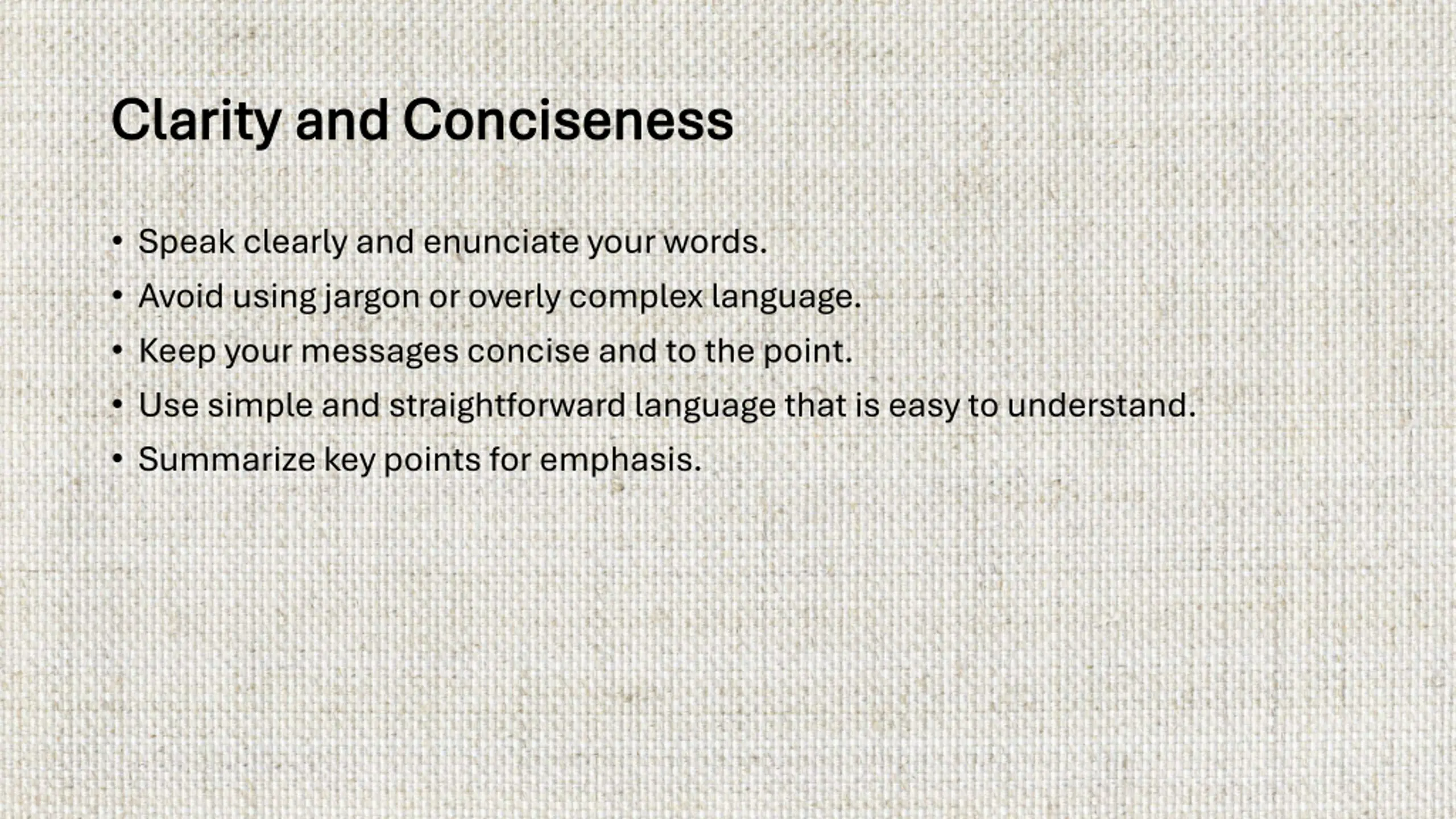 Clarity and Conciseness Clarity and Conciseness Speak clearly and enunciate your words. Avoid using jargon or overly complex language. Keep your messages concise and to the point. Use simple and straightforward language that is easy to understand. Summarize key points for emphasis.