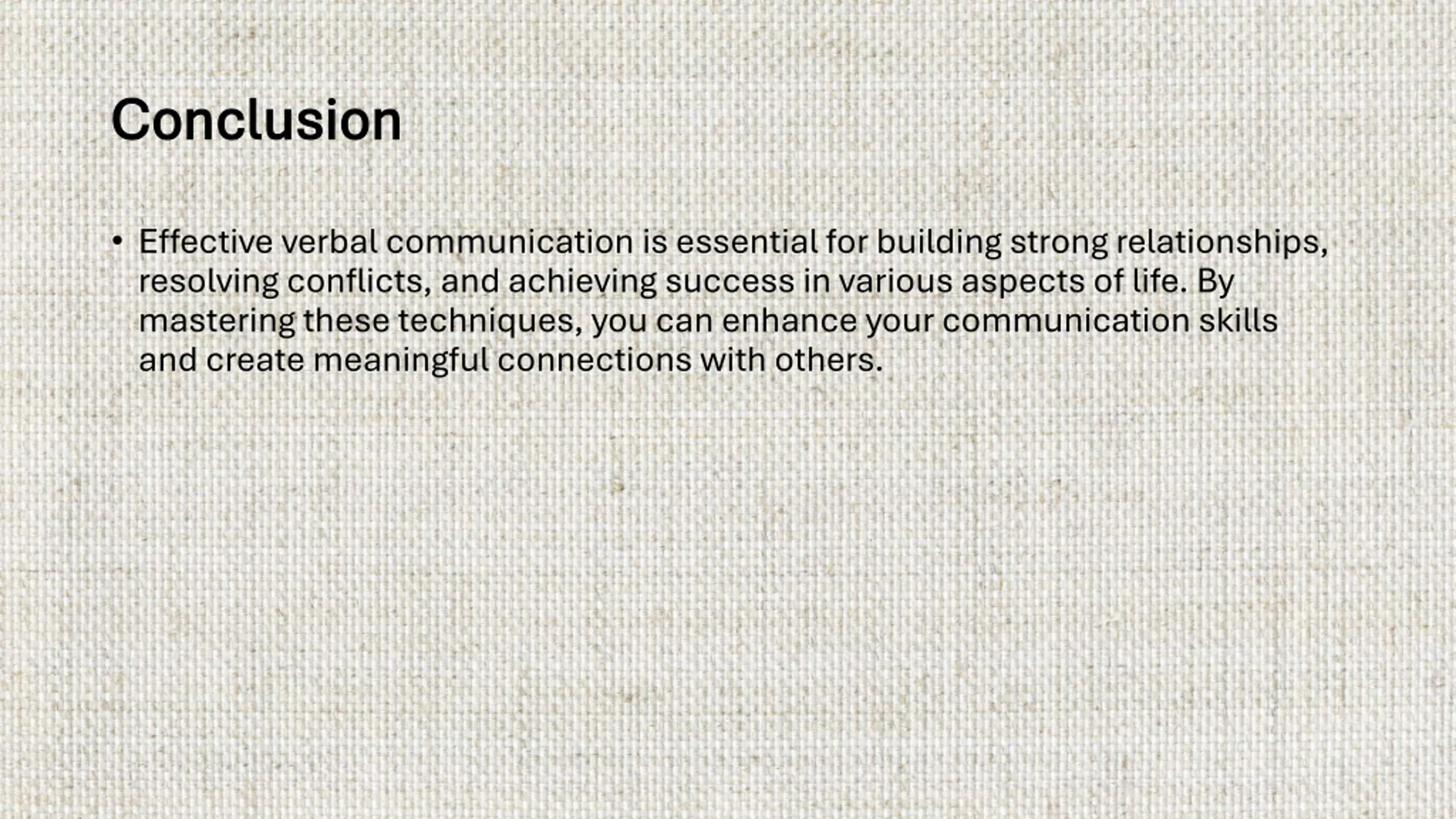 Conclusion Conclusion Effective verbal communication is essential for building strong relationships, resolving conflicts, and achieving success in various aspects of life. By mastering these techniques, you can enhance your communication skills and create meaningful connections with others.