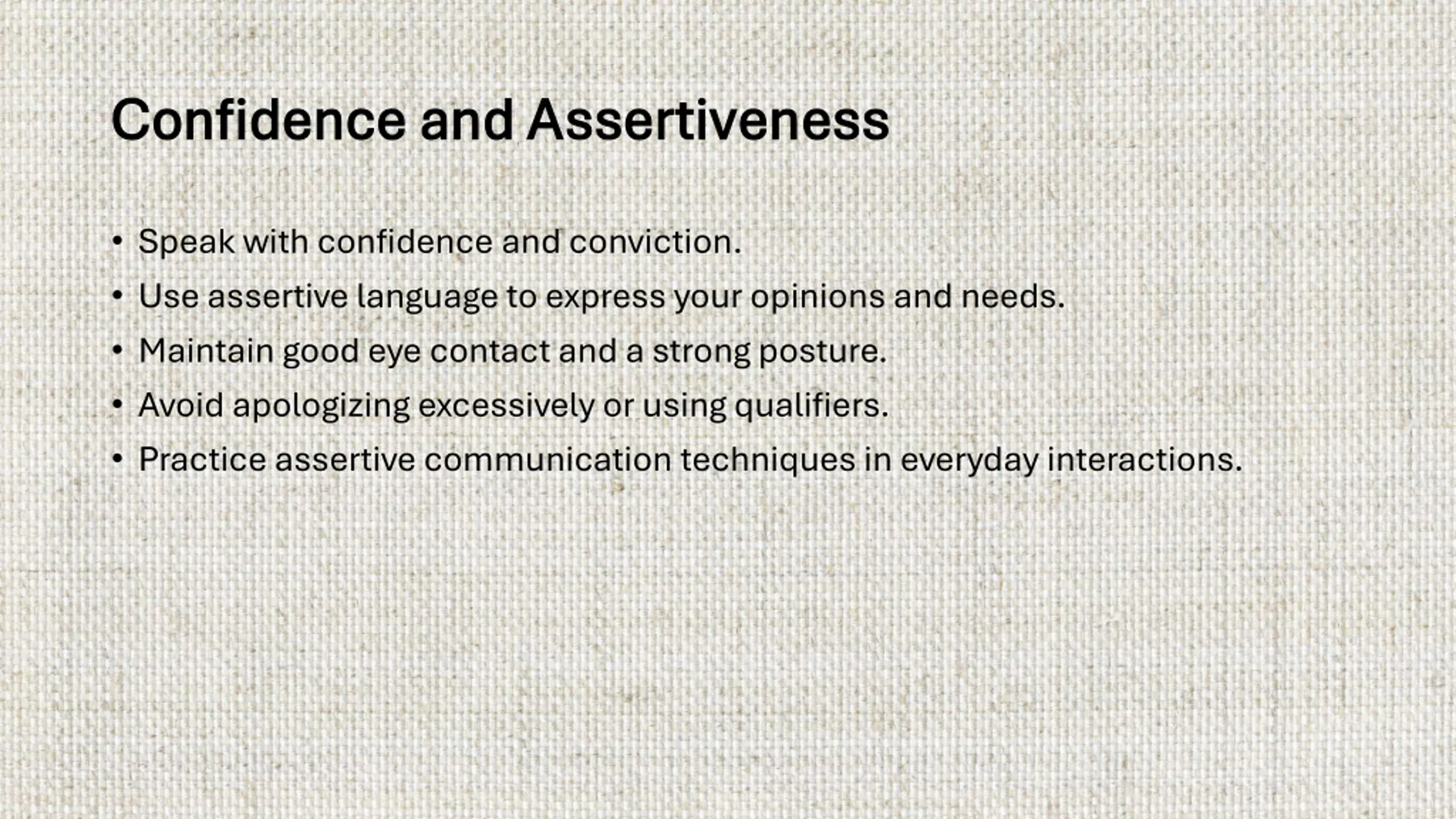 Confidence and Assertiveness Confidence and Assertiveness Speak with confidence and conviction. Use assertive language to express your opinions and needs. Maintain good eye contact and a strong posture. Avoid apologizing excessively or using qualifiers. Practice assertive communication techniques in everyday interactions.