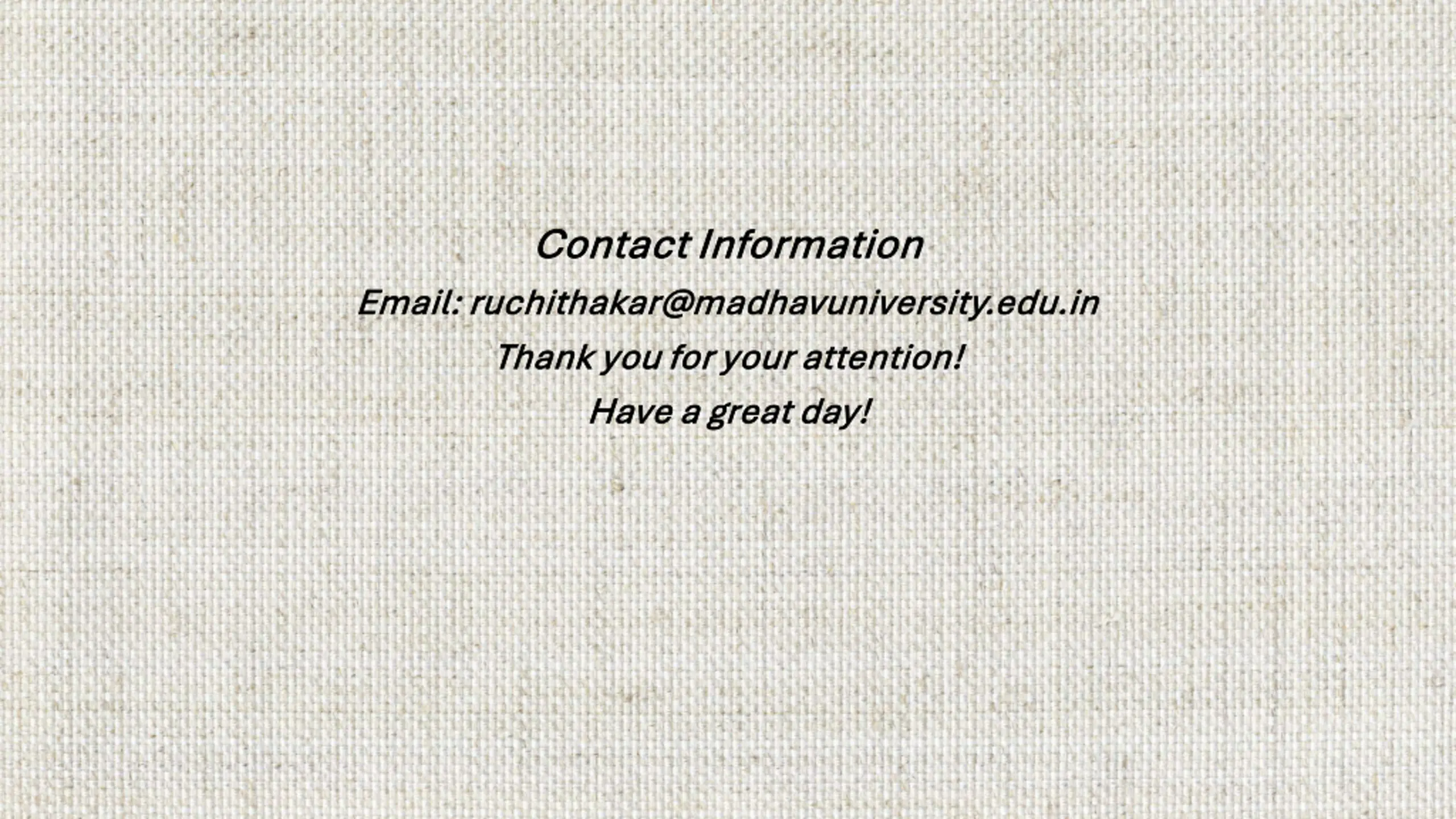 Contact Information Contact Information Email: ruchithakar@madhavuniversity.edu.in Email: ruchithakar@madhavuniversity.edu.in Thank you for your attention! Thank you for your attention! Have a great day! Have a great day!