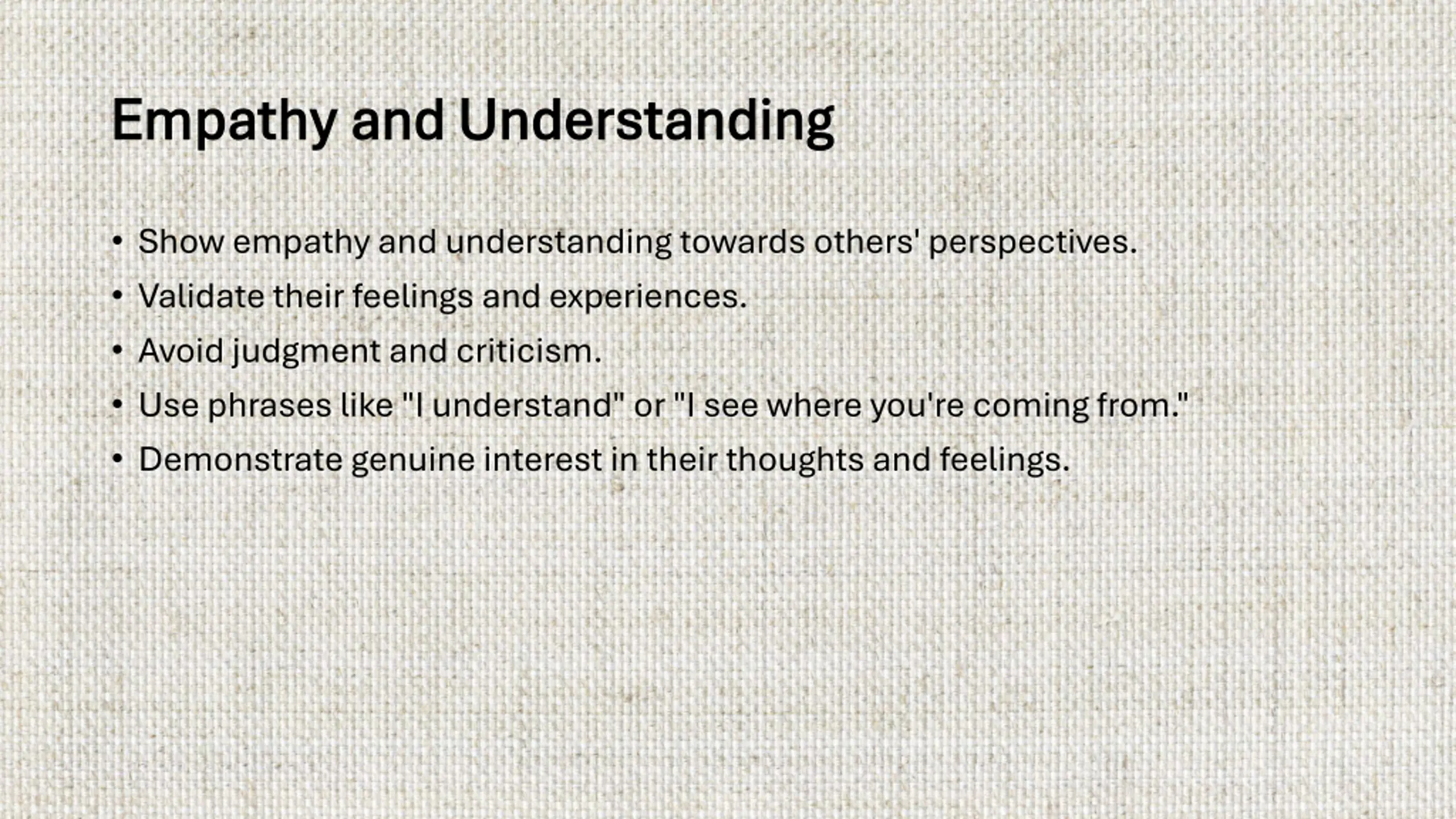 Empathy and Understanding Empathy and Understanding Show empathy and understanding towards others' perspectives. Validate their feelings and experiences. Avoid judgment and criticism. Use phrases like "I understand" or "I see where you're coming from." Demonstrate genuine interest in their thoughts and feelings.