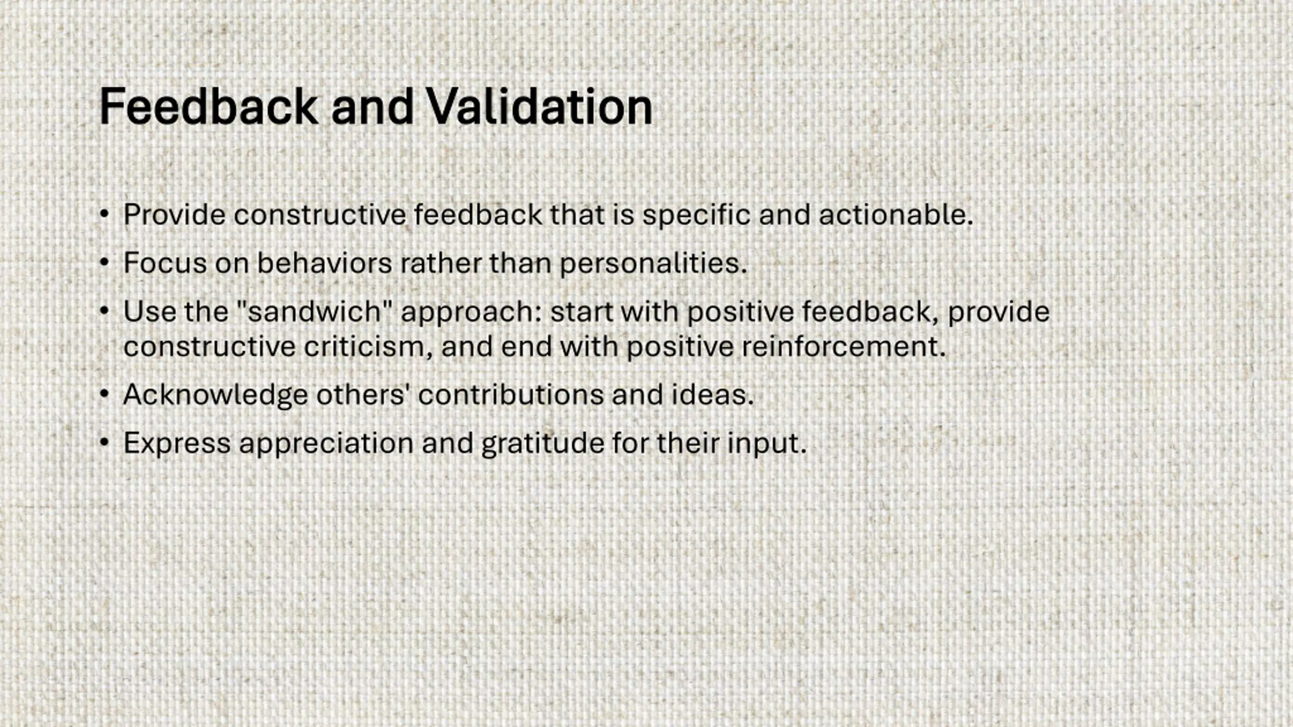 Feedback and Validation Feedback and Validation Provide constructive feedback that is specific and actionable. Focus on behaviors rather than personalities. Use the "sandwich" approach: start with positive feedback, provide constructive criticism, and end with positive reinforcement. Acknowledge others' contributions and ideas. Express appreciation and gratitude for their input.