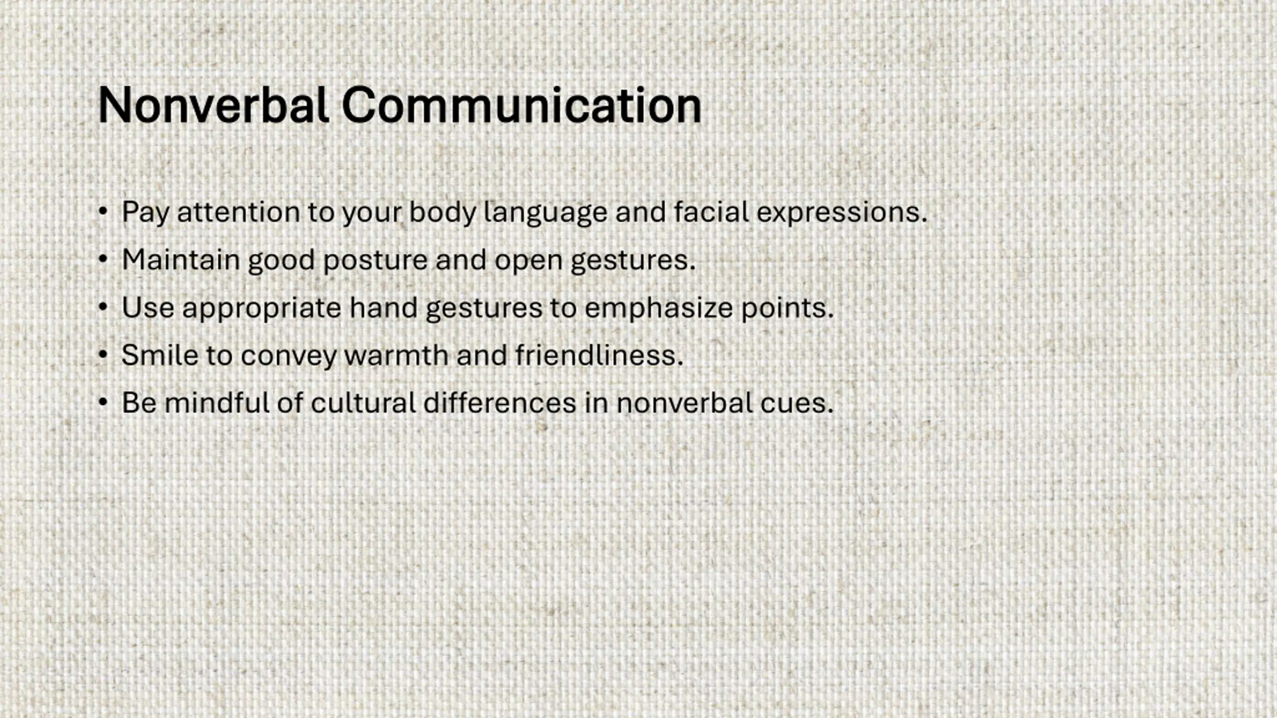 Nonverbal Communication Nonverbal Communication Pay attention to your body language and facial expressions. Maintain good posture and open gestures. Use appropriate hand gestures to emphasize points. Smile to convey warmth and friendliness. Be mindful of cultural differences in nonverbal cues.