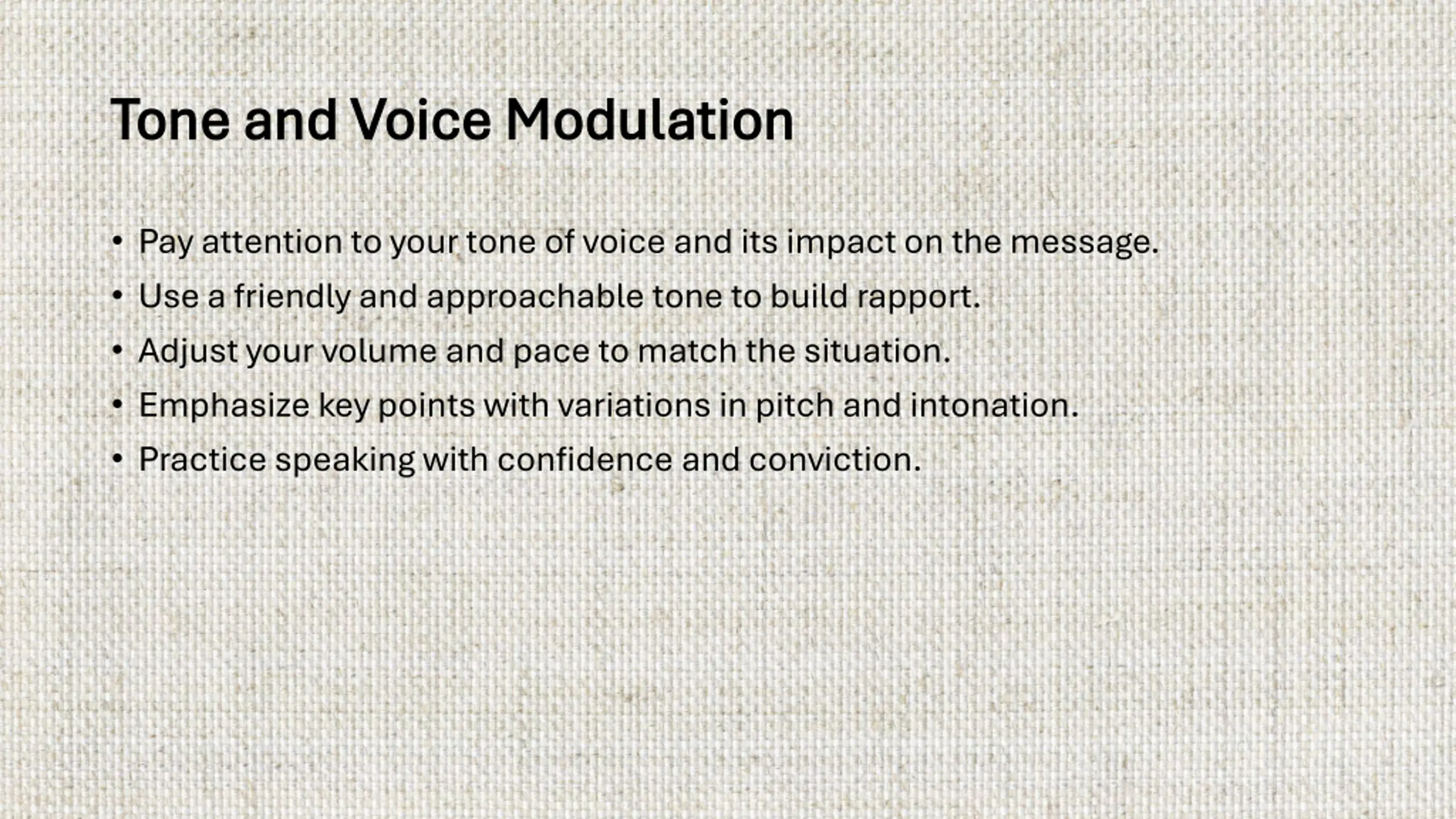 Tone and Voice Modulation Tone and Voice Modulation Pay attention to your tone of voice and its impact on the message. Use a friendly and approachable tone to build rapport. Adjust your volume and pace to match the situation. Emphasize key points with variations in pitch and intonation. Practice speaking with confidence and conviction.