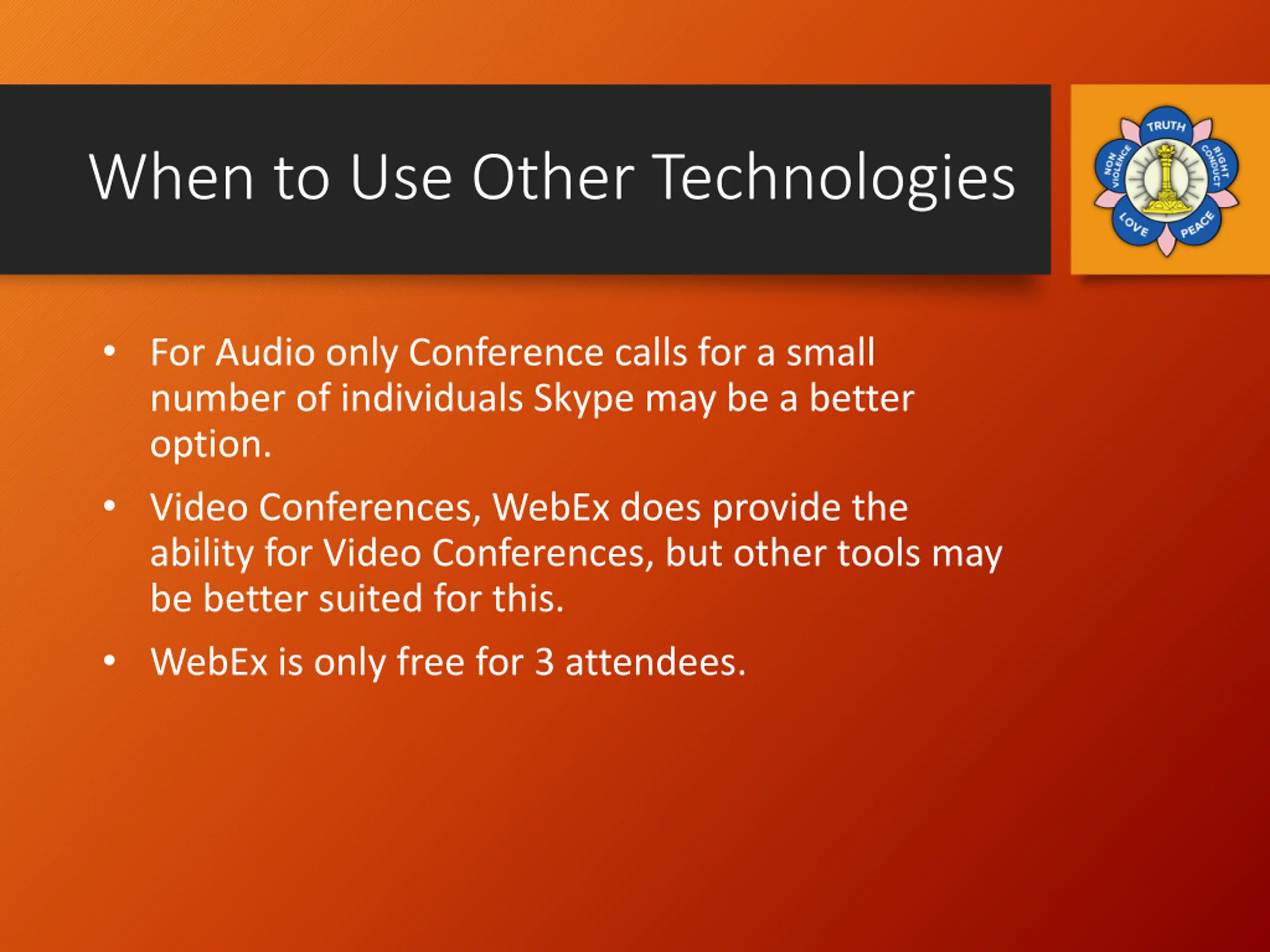 When to Use Other Technologies For Audio only Conference calls for a small number of individuals Skype may be a better option. Video Conferences, WebEx does provide the ability for Video Conferences, but other tools may be better suited for this. WebEx is only free for 3 attendees.