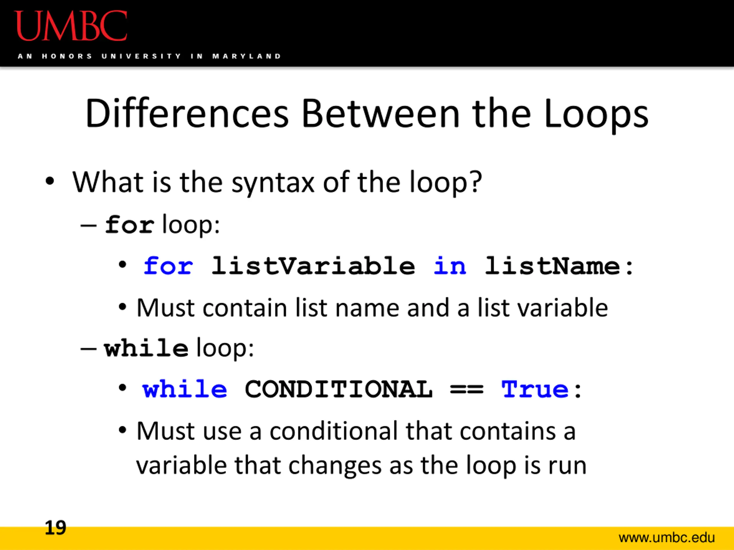 Differences Between the Loops Though they are both loops, for loops and while loops behave very differently Even when we use range() What does the loop do? for loop: Iterate over a list while loop: Evaluate a conditional What?! Remember, range() creates a list of numbers! 18 www.umbc.edu