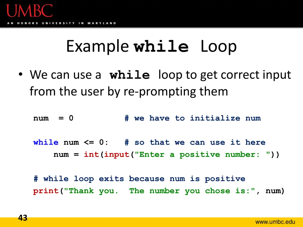 When to Use while Loops while loops are very helpful when you: Want to get input from the user that meets certain specific conditions Positive number A non-empty string Want to keep getting input until some end User inputs a value that means they re finished Reached the end of some input (a file, etc.) 42 www.umbc.edu