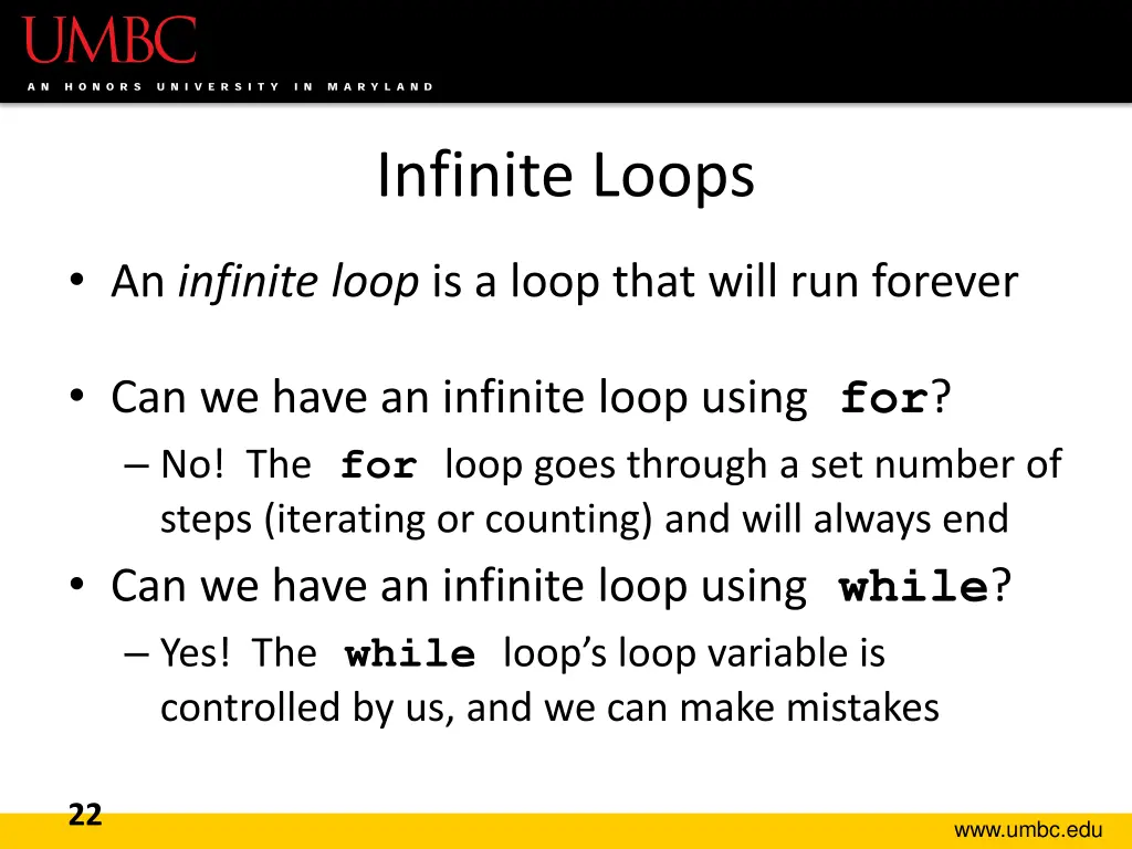 Infinite Loops An infinite loop is a loop that will run forever Can we have an infinite loop using for? No! The for loop goes through a set number of steps (iterating or counting) and will always end Can we have an infinite loop using while? Yes! The while loop s loop variable is controlled by us, and we can make mistakes 22 www.umbc.edu