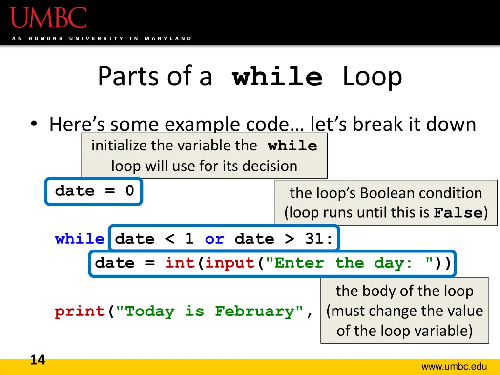 Parts of a while Loop Here s some example code let s break it down date = 0 while date < 1 or date > 31: date = int(input("Enter the day: ")) print("Today is February", date) 13 www.umbc.edu