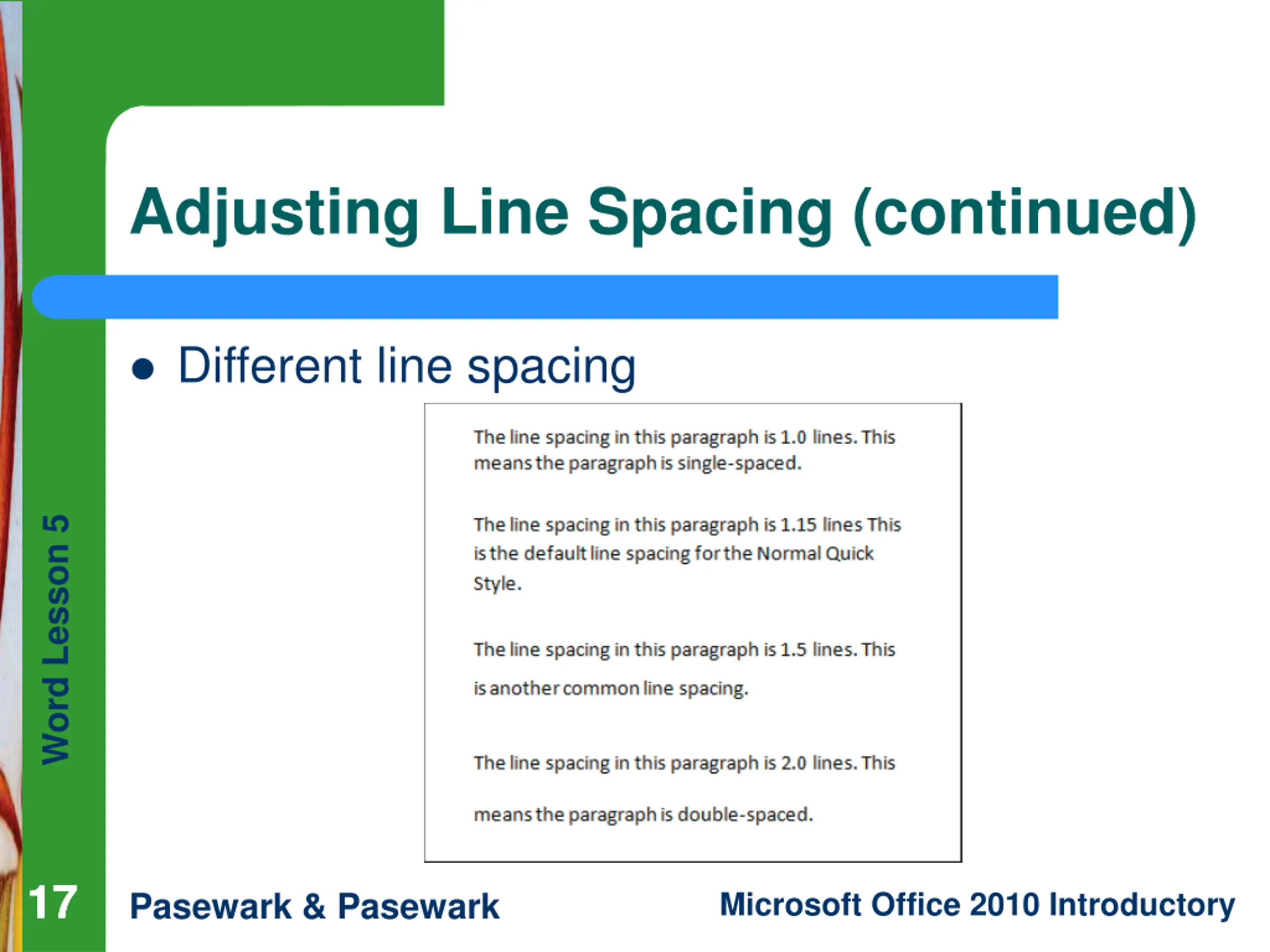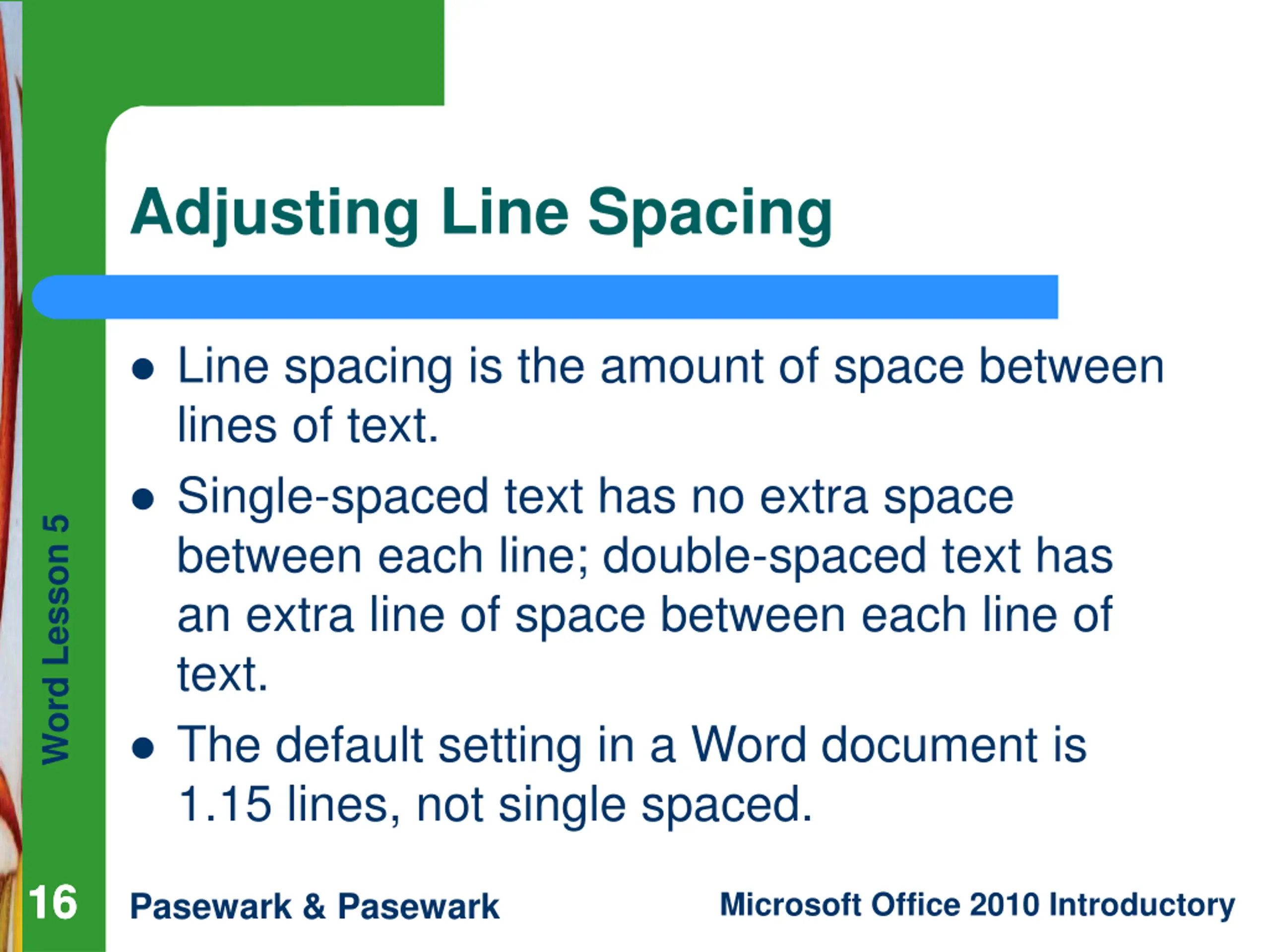 Adjusting Line Spacing Line spacing is the amount of space between lines of text. Single-spaced text has no extra space between each line; double-spaced text has an extra line of space between each line of text. The default setting in a Word document is 1.15 lines, not single spaced. Word Lesson 5 16 16 16 Pasewark & Pasewark Microsoft Office 2010 Introductory