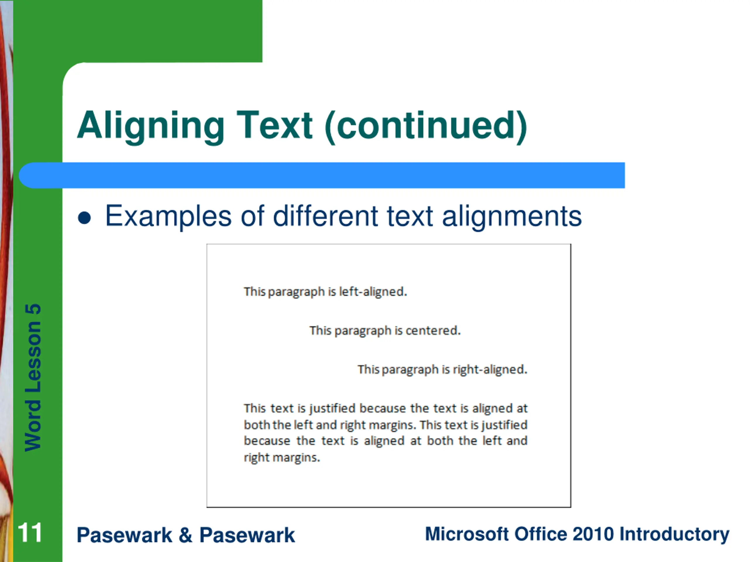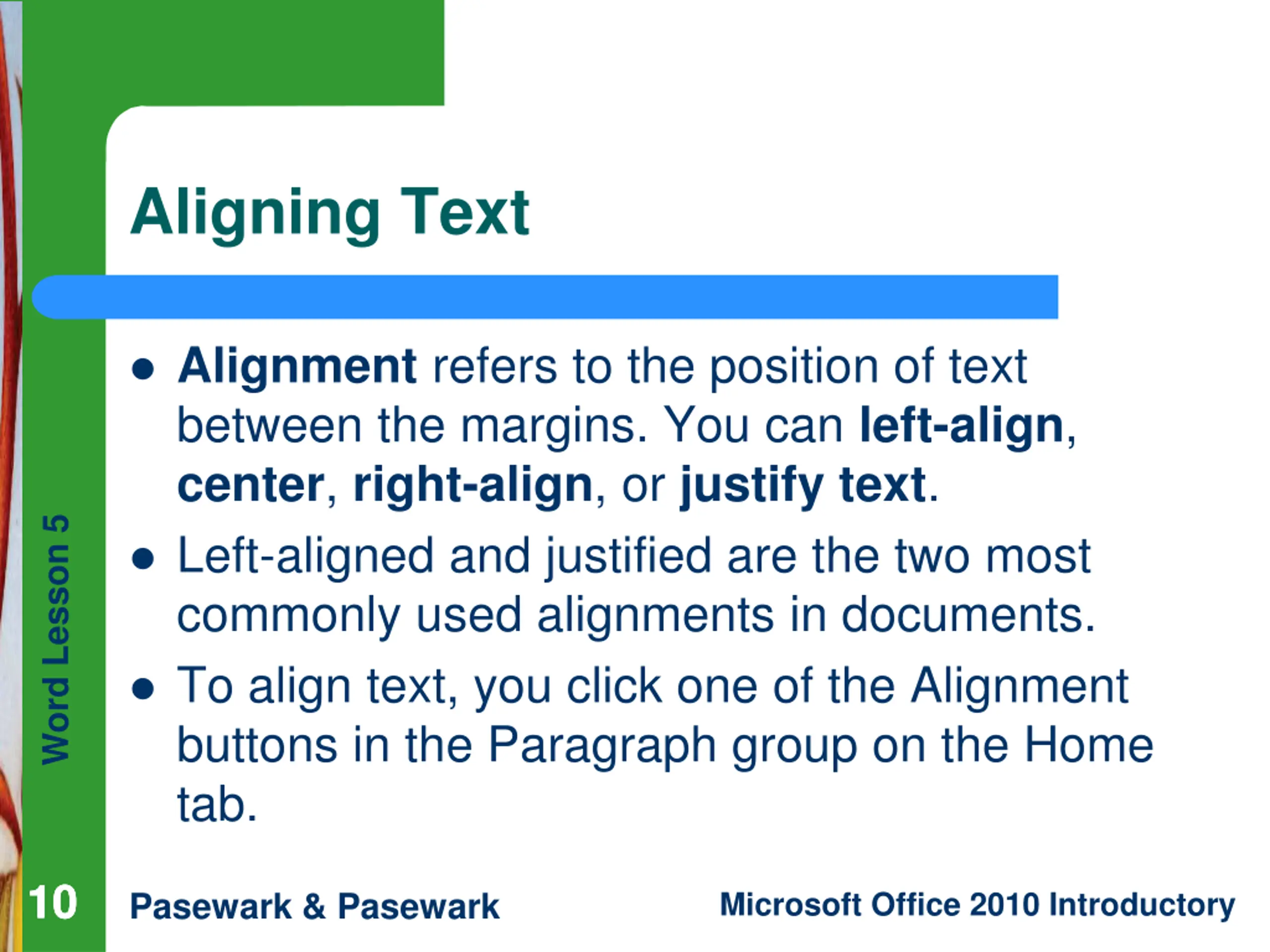 Aligning Text Alignment refers to the position of text between the margins. You can left-align, center, right-align, or justify text. Left-aligned and justified are the two most commonly used alignments in documents. To align text, you click one of the Alignment buttons in the Paragraph group on the Home tab. Word Lesson 5 10 10 10 Pasewark & Pasewark Microsoft Office 2010 Introductory