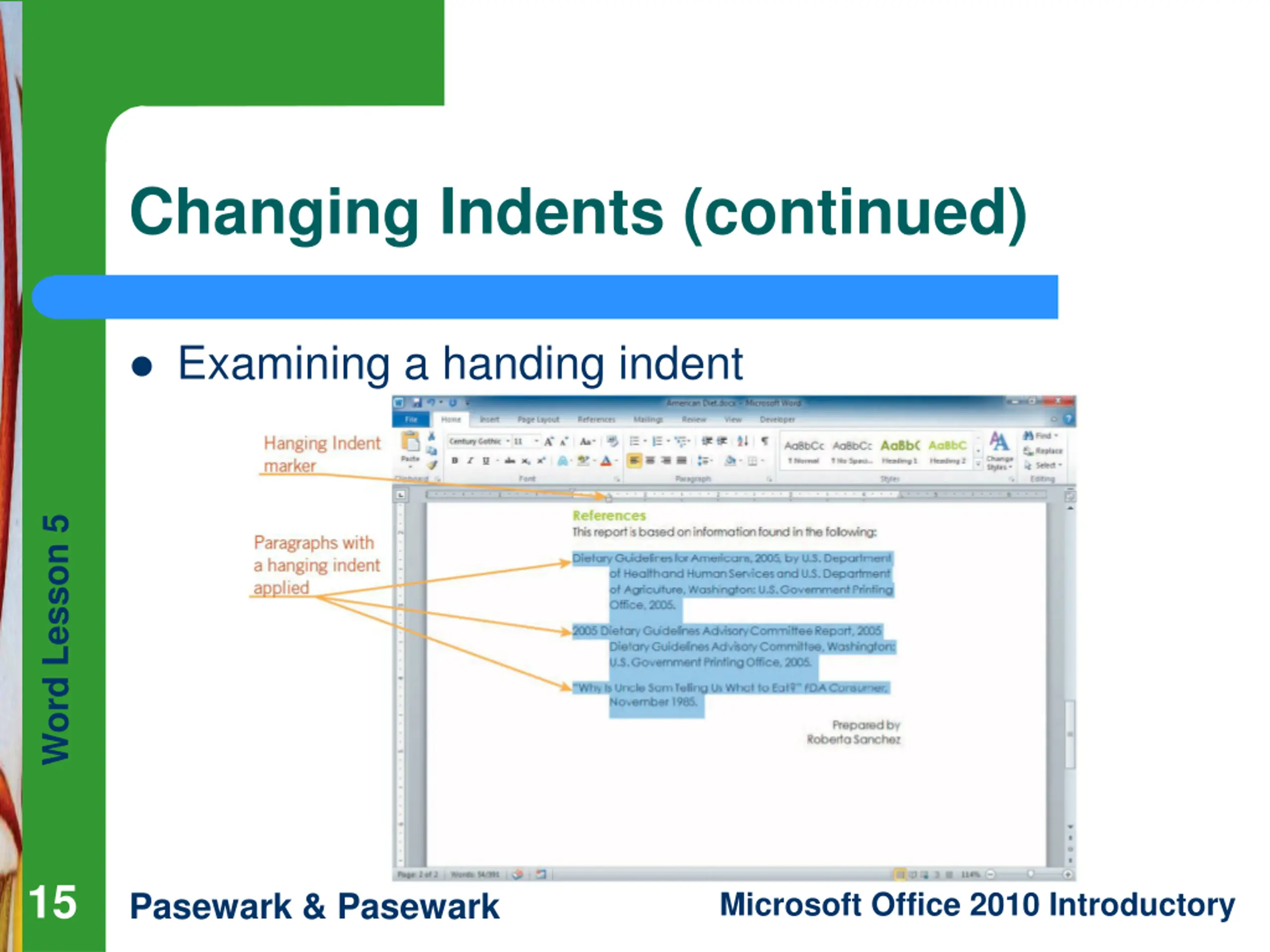 Changing Indents (continued) Examining a handing indent Word Lesson 5 15 Pasewark & Pasewark Microsoft Office 2010 Introductory