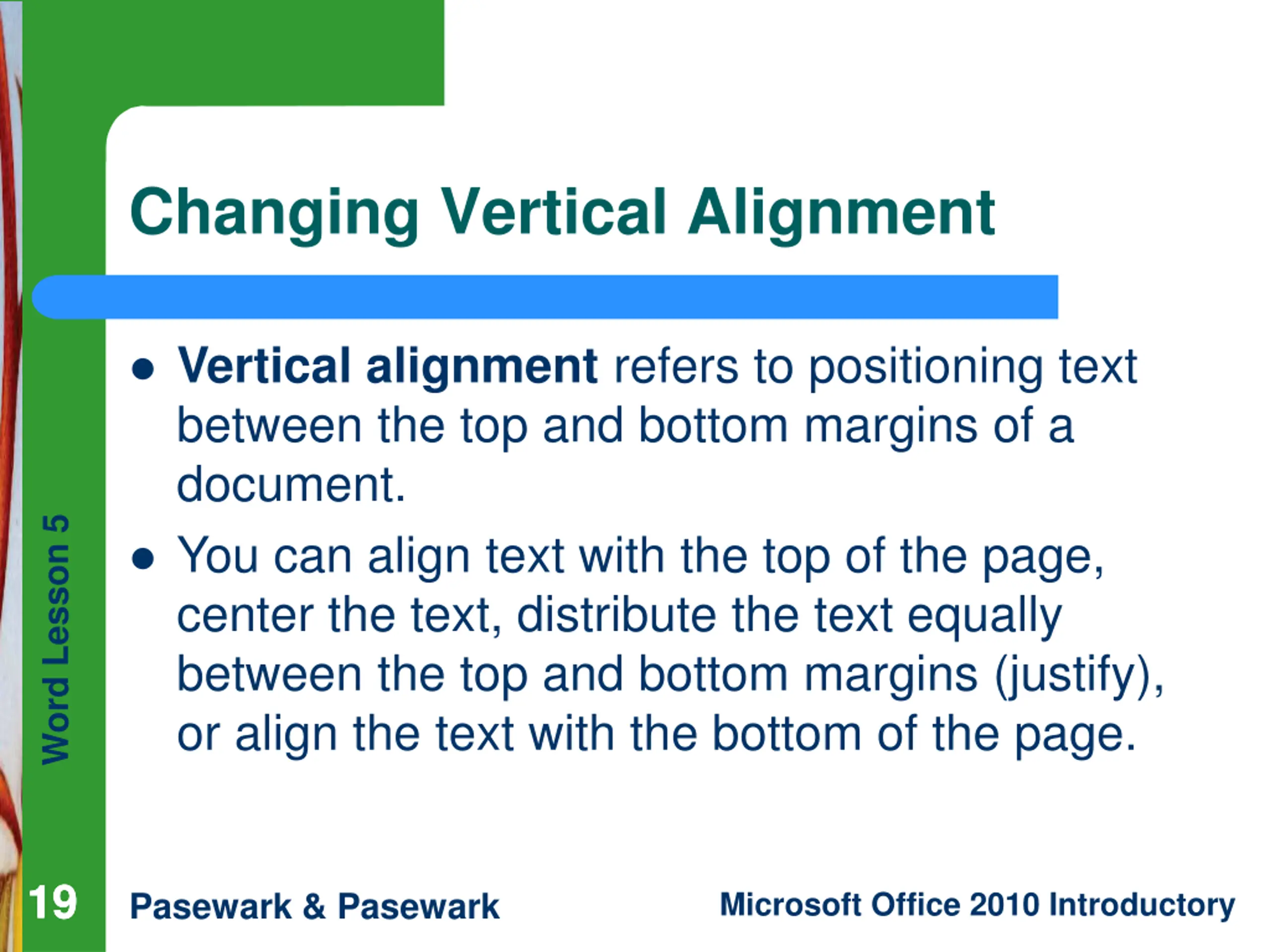 Changing Vertical Alignment Vertical alignment refers to positioning text between the top and bottom margins of a document. You can align text with the top of the page, center the text, distribute the text equally between the top and bottom margins (justify), or align the text with the bottom of the page. Word Lesson 5 19 19 19 Pasewark & Pasewark Microsoft Office 2010 Introductory