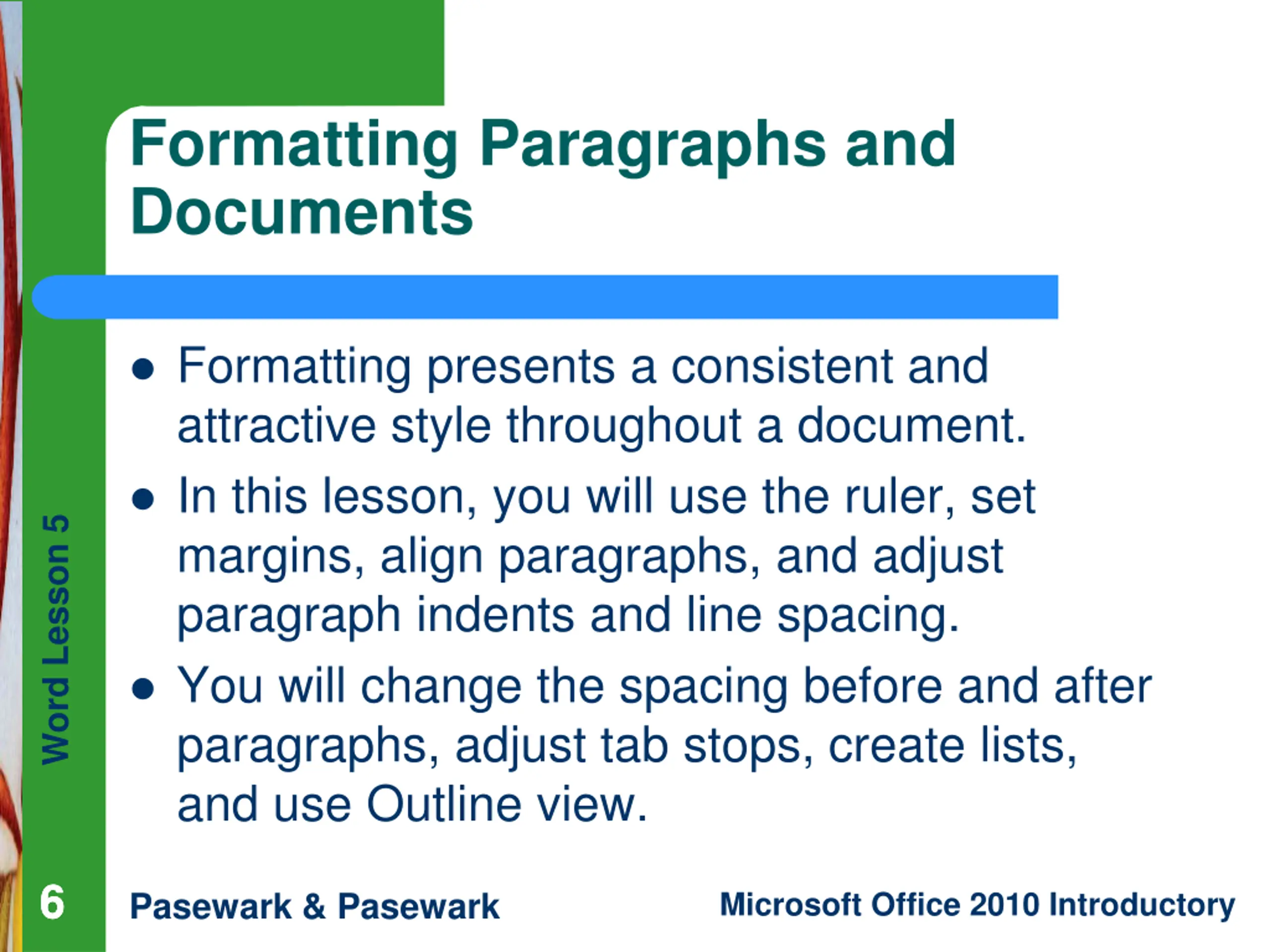 Formatting Paragraphs and Documents Formatting presents a consistent and attractive style throughout a document. In this lesson, you will use the ruler, set margins, align paragraphs, and adjust paragraph indents and line spacing. You will change the spacing before and after paragraphs, adjust tab stops, create lists, and use Outline view. Word Lesson 5 6 6 6 Pasewark & Pasewark Microsoft Office 2010 Introductory