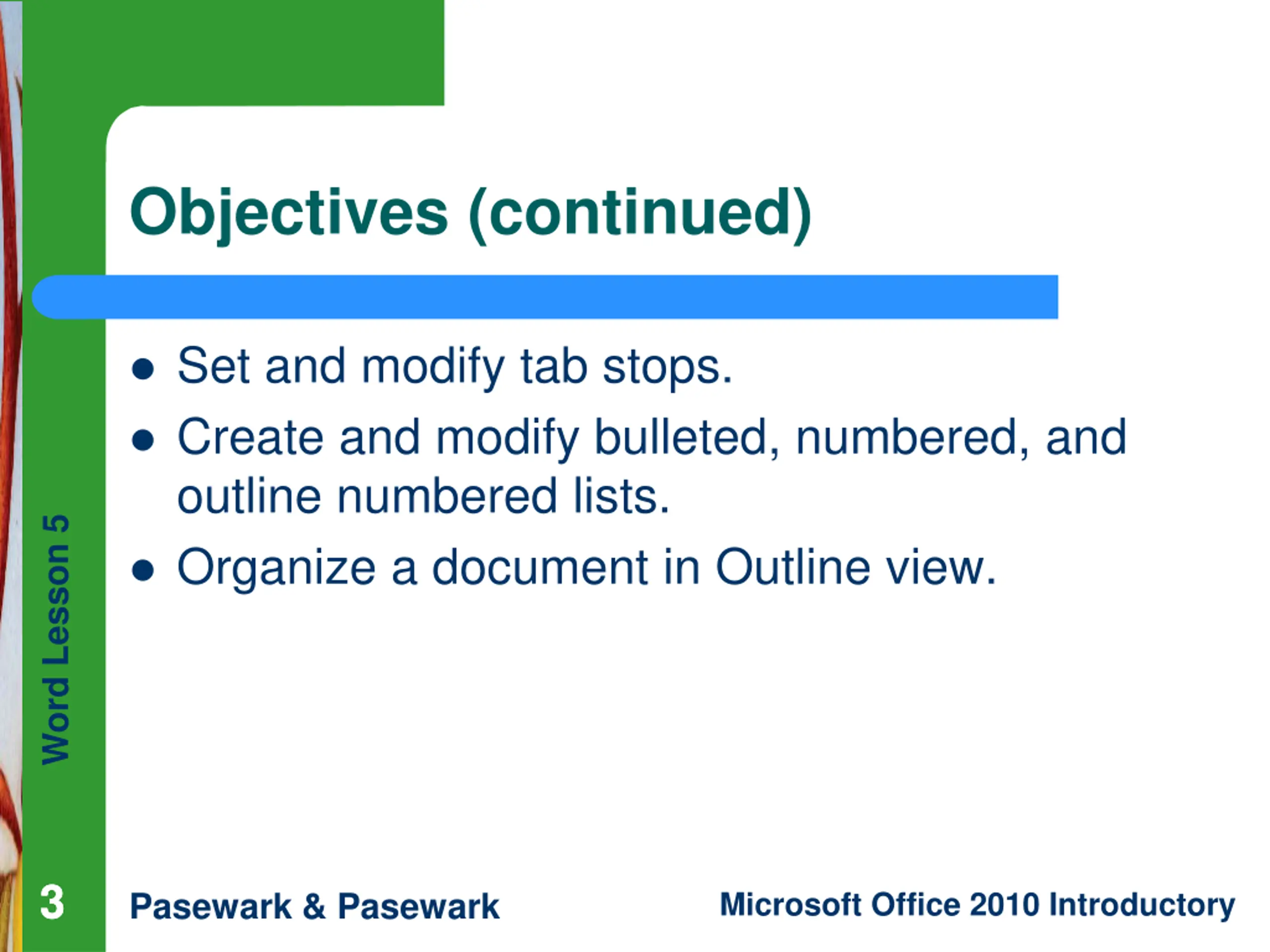 Objectives (continued) Set and modify tab stops. Create and modify bulleted, numbered, and outline numbered lists. Organize a document in Outline view. Word Lesson 5 3 3 3 Pasewark & Pasewark Microsoft Office 2010 Introductory