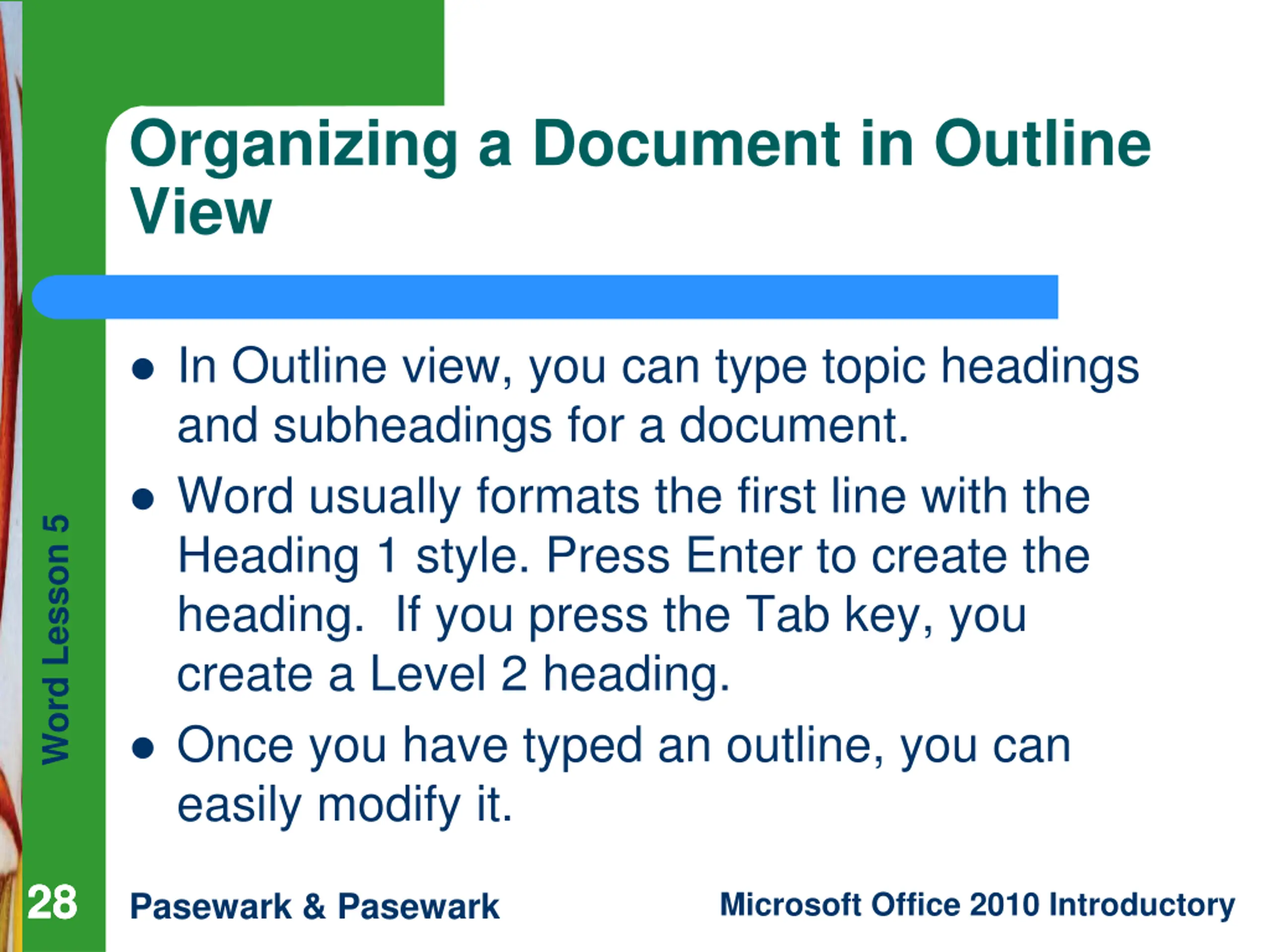Organizing a Document in Outline View In Outline view, you can type topic headings and subheadings for a document. Word usually formats the first line with the Heading 1 style. Press Enter to create the heading. If you press the Tab key, you create a Level 2 heading. Once you have typed an outline, you can easily modify it. Word Lesson 5 28 28 28 Pasewark & Pasewark Microsoft Office 2010 Introductory