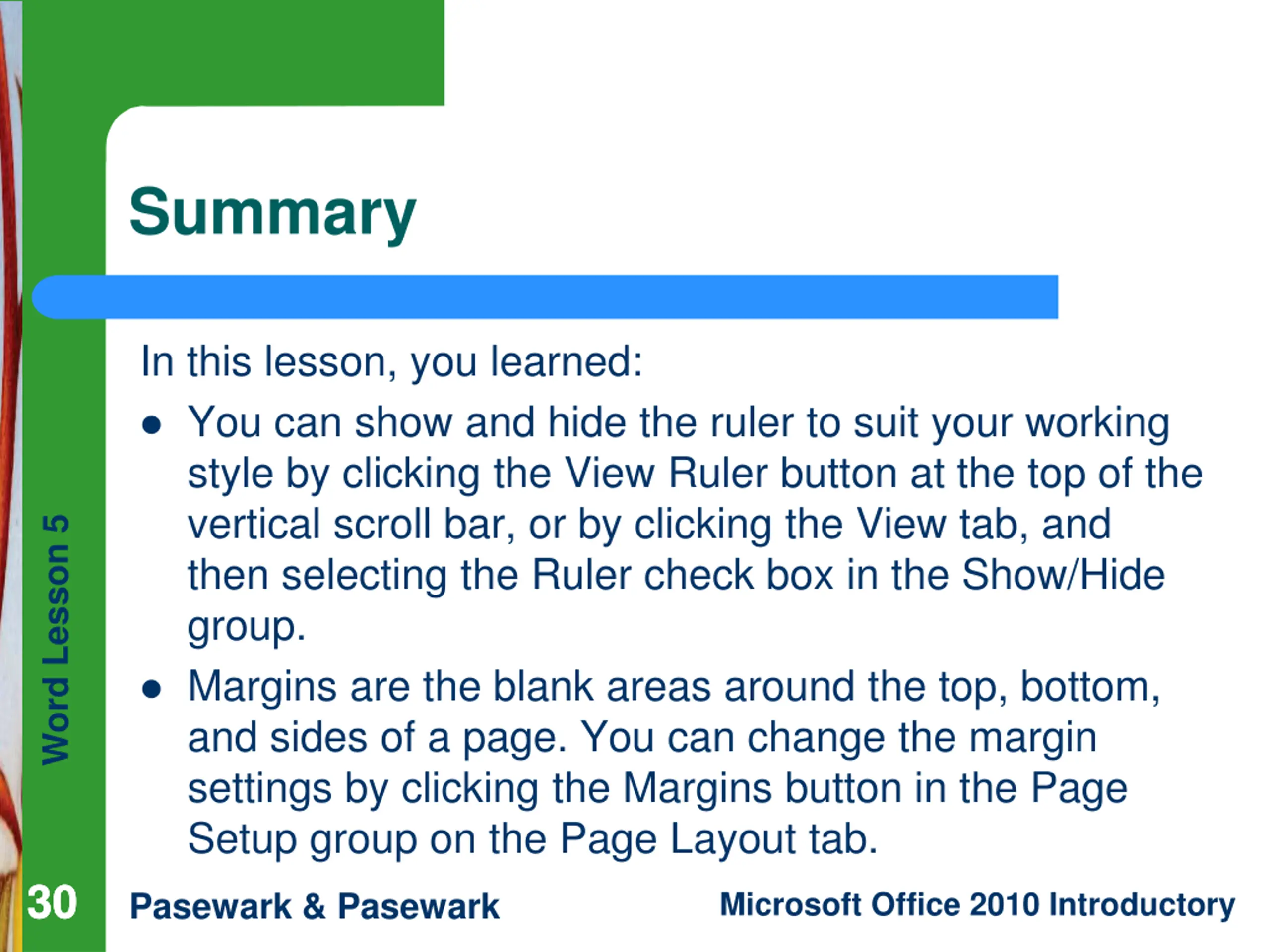 Summary In this lesson, you learned: You can show and hide the ruler to suit your working style by clicking the View Ruler button at the top of the vertical scroll bar, or by clicking the View tab, and then selecting the Ruler check box in the Show/Hide group. Margins are the blank areas around the top, bottom, and sides of a page. You can change the margin settings by clicking the Margins button in the Page Setup group on the Page Layout tab. Word Lesson 5 30 30 30 Pasewark & Pasewark Microsoft Office 2010 Introductory