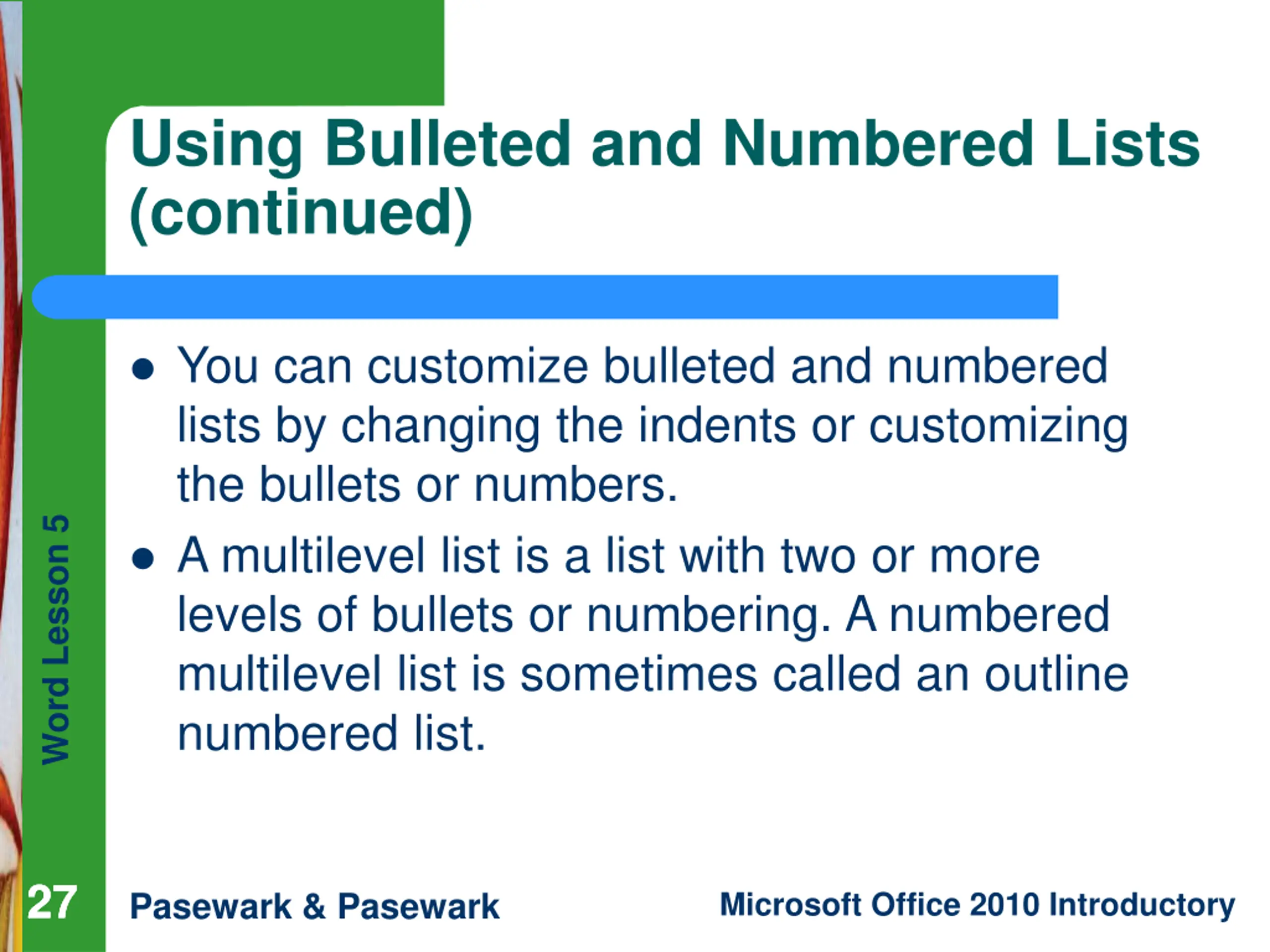 Using Bulleted and Numbered Lists (continued) You can customize bulleted and numbered lists by changing the indents or customizing the bullets or numbers. A multilevel list is a list with two or more levels of bullets or numbering. A numbered multilevel list is sometimes called an outline numbered list. Word Lesson 5 27 27 27 Pasewark & Pasewark Microsoft Office 2010 Introductory