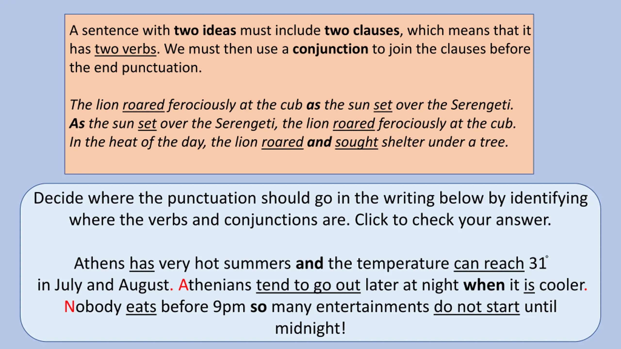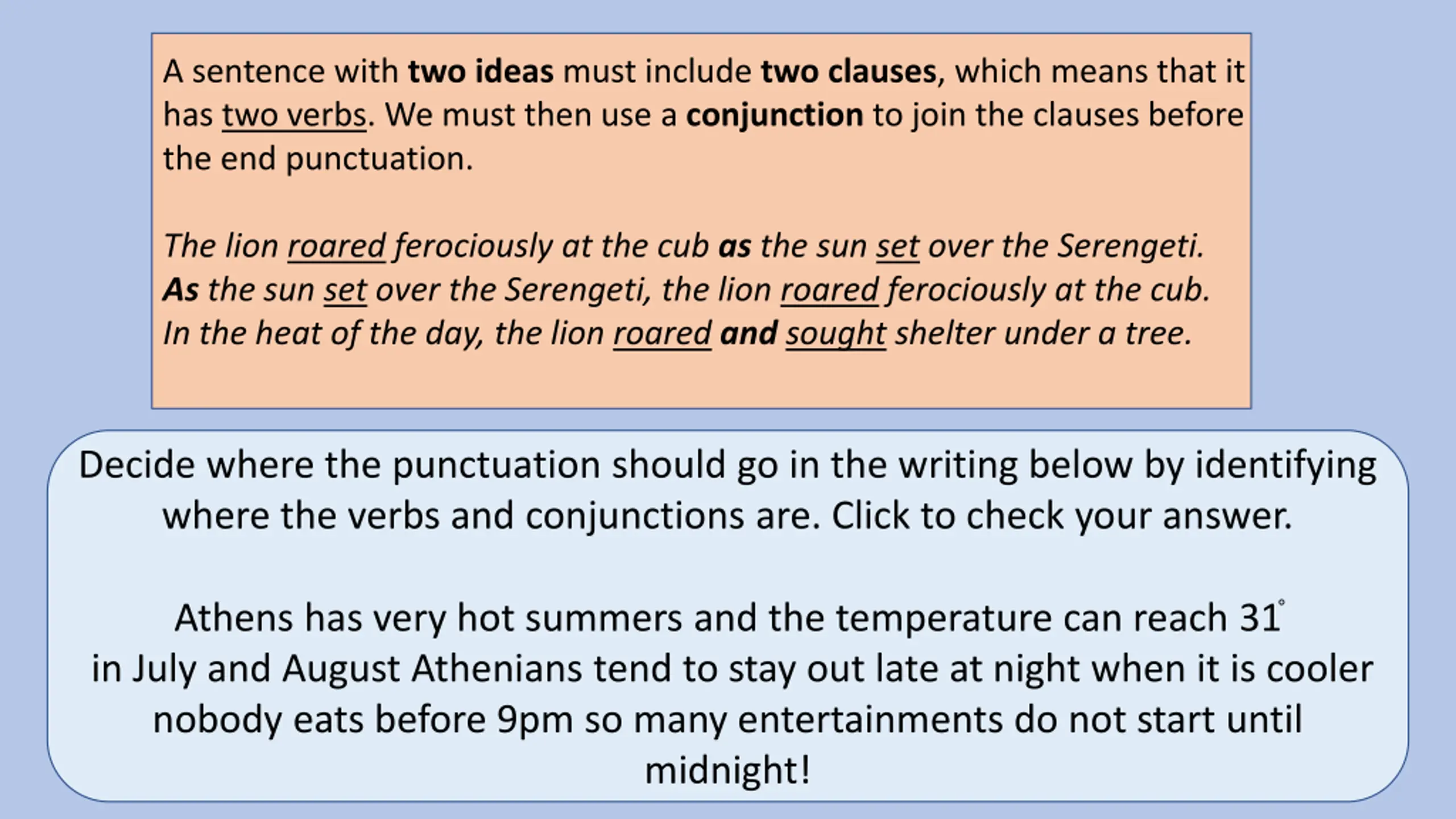 A sentence with two ideas must include two clauses,which means that it has two verbs. We must then use a conjunction to join the clauses before the end punctuation. The lion roared ferociously at the cub as the sun set over the Serengeti. As the sun set over the Serengeti, the lion roared ferociously at the cub. In the heat of the day, the lion roared and sought shelter under a tree. Decide where the punctuation should go in the writing below by identifying where the verbs and conjunctions are. Click to check your answer. Athens has very hot summers and the temperature can reach 31 in July and August. Athenians tend to go out later at night when it is cooler. Nobody eats before 9pm so many entertainments do not start until midnight!