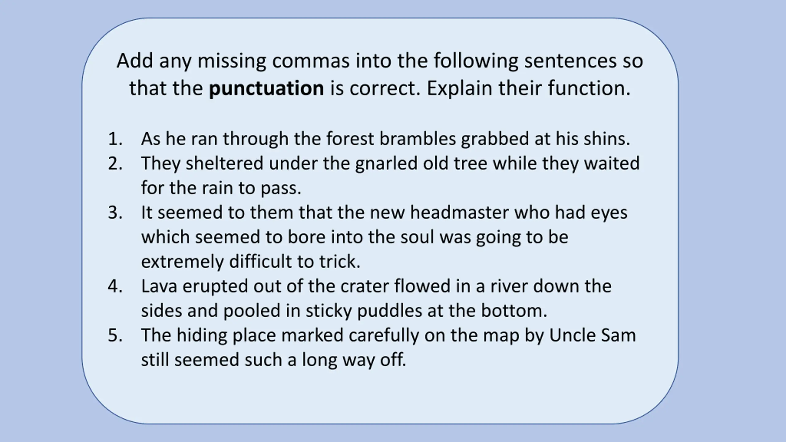 Add any missing commas into the following sentences so that the punctuation is correct. Explain their function. 1. As he ran through the forest brambles grabbed at his shins. 2. They sheltered under the gnarled old tree while they waited for the rain to pass. 3. It seemed to them that the new headmaster who had eyes which seemed to bore into the soul was going to be extremely difficult to trick. 4. Lava erupted out of the crater flowed in a river down the sides and pooled in sticky puddles at the bottom. 5. The hiding place marked carefully on the map by Uncle Sam still seemed such a long way off.