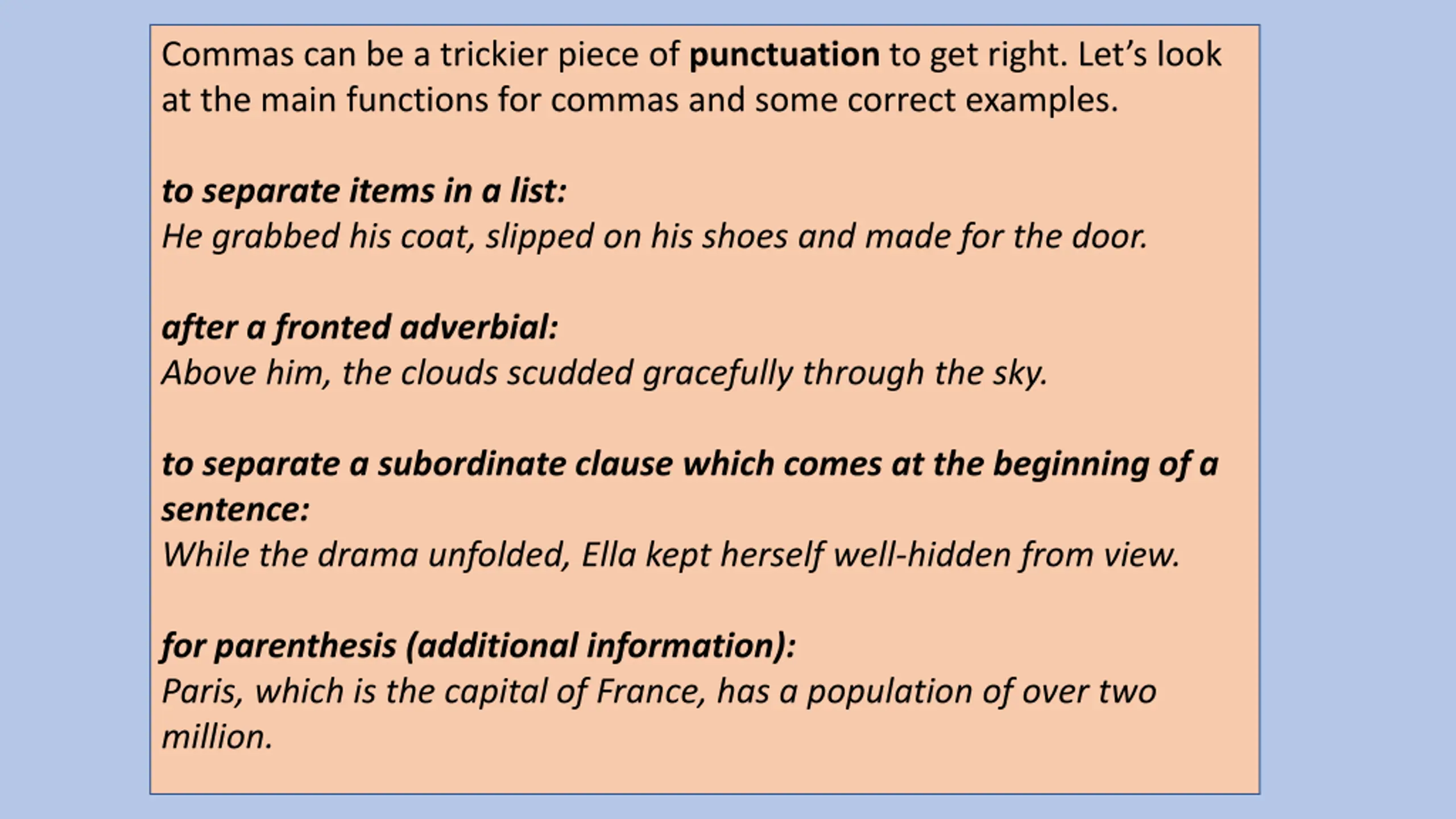 Commas can be a trickier piece of punctuationto get right. Lets look at the main functions for commas and some correct examples. to separate items in a list: He grabbed his coat, slipped on his shoes and made for the door. after a fronted adverbial: Above him, the clouds scudded gracefully through the sky. to separate a subordinate clause which comes at the beginning of a sentence: While the drama unfolded, Ella kept herself well-hidden from view. for parenthesis (additional information): Paris, which is the capital of France, has a population of over two million.