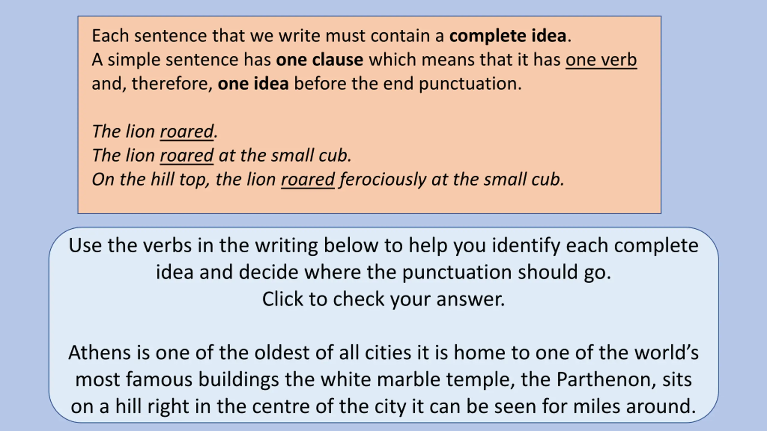 Each sentence that we write must contain a complete idea. A simple sentence has oneclause which means that it has one verb and, therefore, one idea before the end punctuation. The lion roared. The lion roared at the small cub. On the hill top, the lion roared ferociously at the small cub. Use the verbs in the writing below to help you identify each complete idea and decide where the punctuation should go. Click to check your answer. Athens is one of the oldest of all cities it is home to one of the world s most famous buildings the white marble temple, the Parthenon, sits on a hill right in the centre of the city it can be seen for miles around.