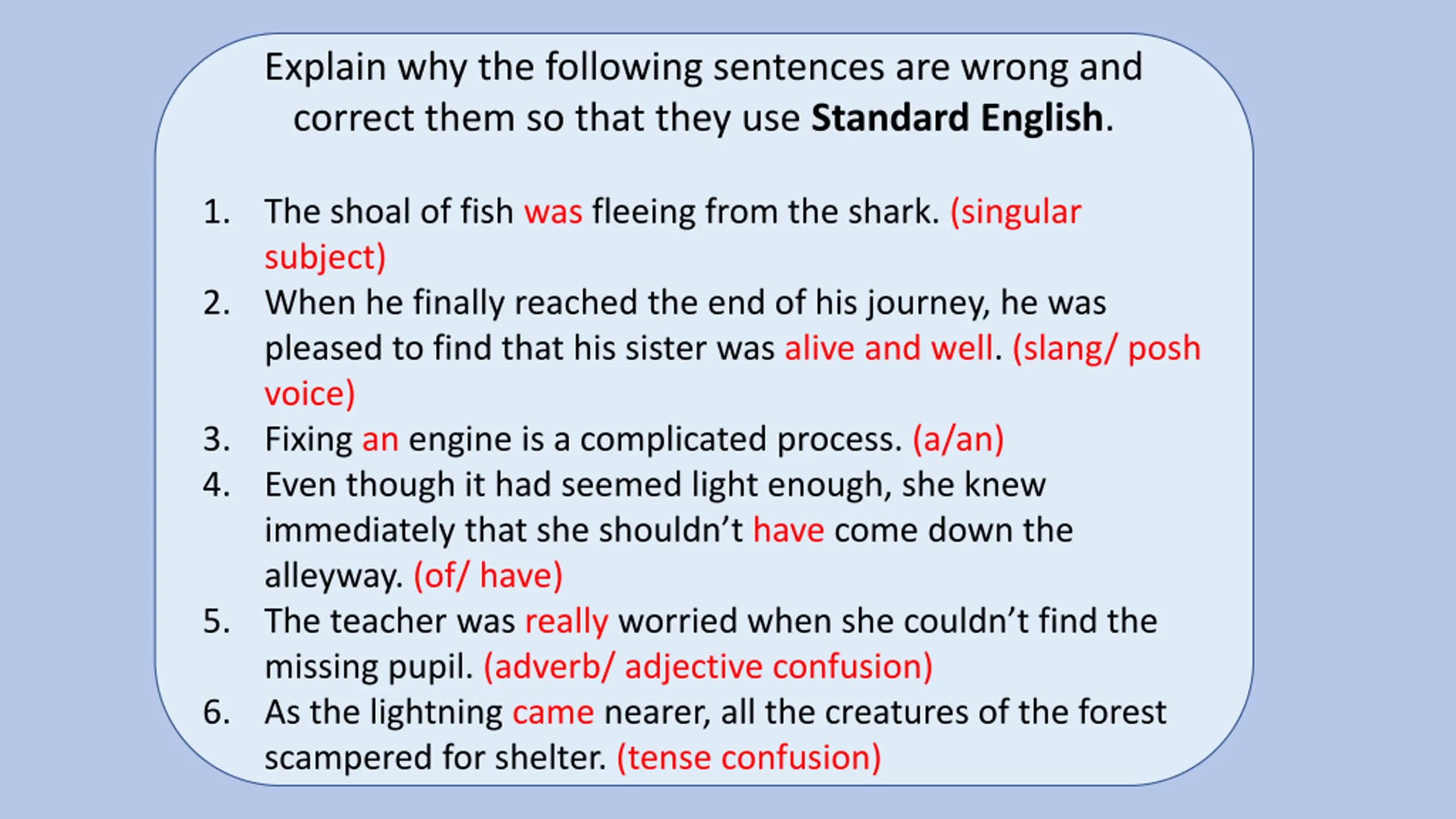 Explain why the following sentences are wrong and correct them so that they use Standard English. 1. The shoal of fish was fleeing from the shark. (singular subject) 2. When he finally reached the end of his journey, he was pleased to find that his sister was alive and well. (slang/ posh voice) 3. Fixing an engine is a complicated process. (a/an) 4. Even though it had seemed light enough, she knew immediately that she shouldn t have come down the alleyway. (of/ have) 5. The teacher was really worried when she couldn t find the missing pupil. (adverb/ adjective confusion) 6. As the lightning came nearer, all the creatures of the forest scampered for shelter. (tense confusion)