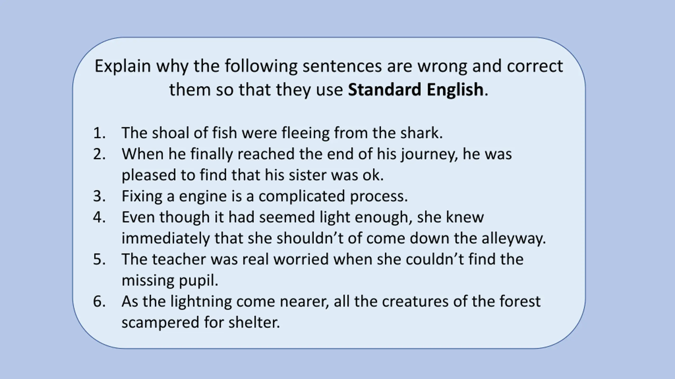 Explain why the following sentences are wrong and correct them so that they use Standard English. 1. The shoal of fish were fleeing from the shark. 2. When he finally reached the end of his journey, he was pleased to find that his sister was ok. 3. Fixing a engine is a complicated process. 4. Even though it had seemed light enough, she knew immediately that she shouldn t of come down the alleyway. 5. The teacher was real worried when she couldn t find the missing pupil. 6. As the lightning come nearer, all the creatures of the forest scampered for shelter.
