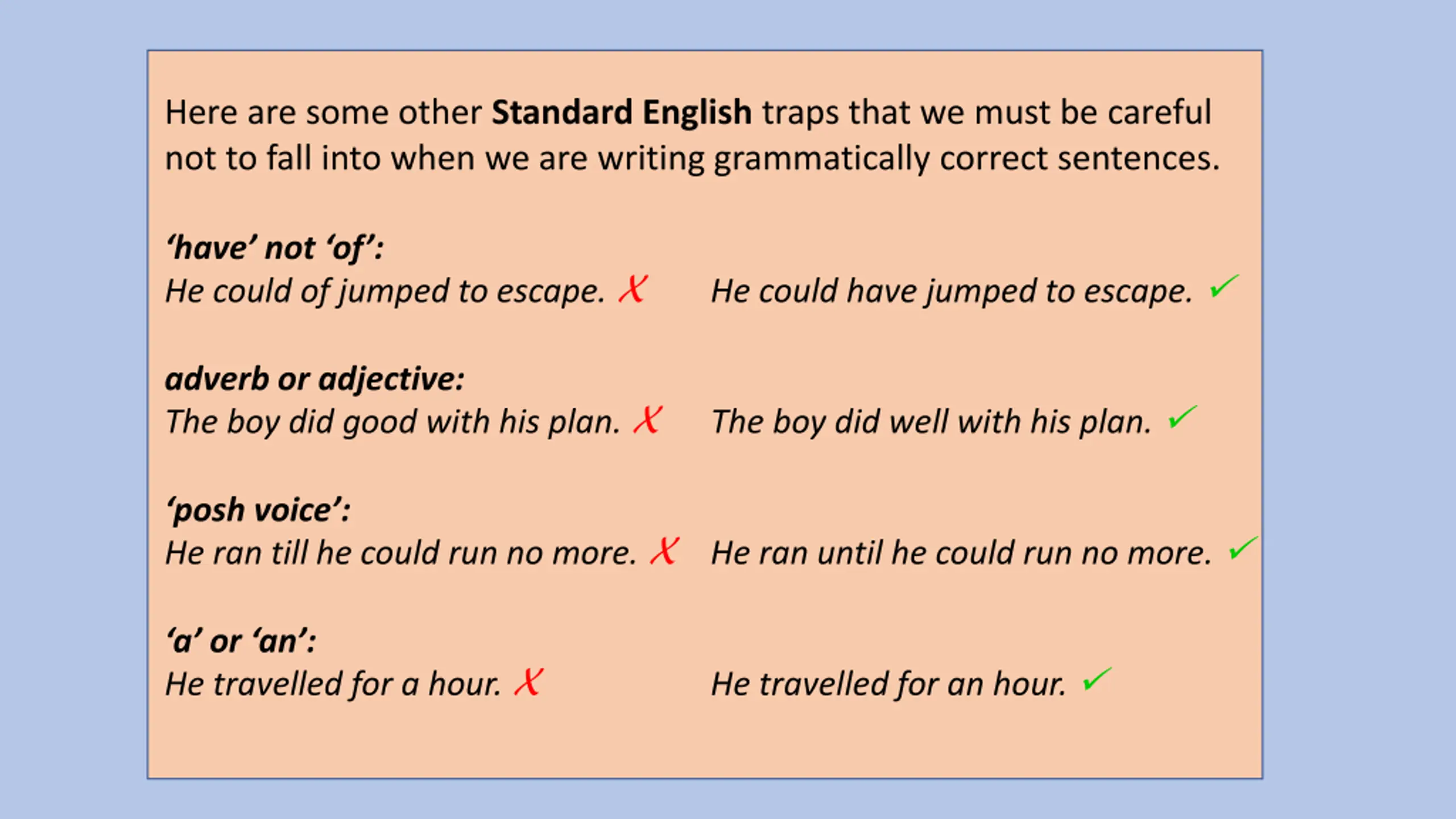 Here are some other Standard English traps that we must be careful not to fall into when we are writing grammatically correct sentences. have not of : He could of jumped to escape. X He could have jumped to escape. adverb or adjective: The boy did good with his plan. X The boy did well with his plan. posh voice : He ran till he could run no more. X He ran until he could run no more. a or an : He travelled for a hour. X He travelled for an hour.