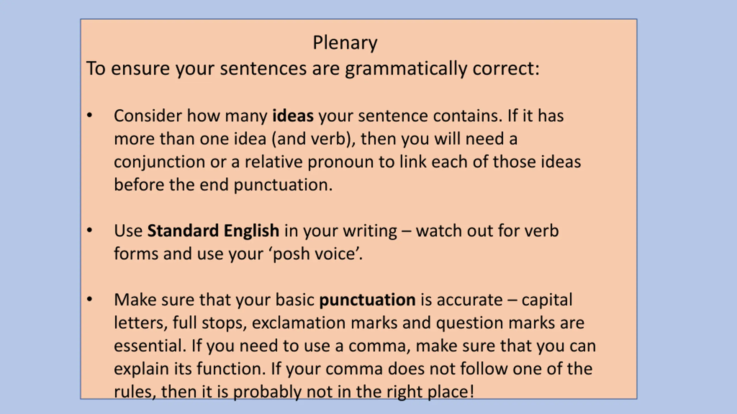 Plenary To ensure your sentences are grammatically correct: Consider how many ideas your sentence contains. If it has more than one idea (and verb), then you will need a conjunction or a relative pronoun to link each of those ideas before the end punctuation. Use Standard English in your writing watch out for verb forms and use your posh voice . Make sure that your basic punctuation is accurate capital letters, full stops, exclamation marks and question marks are essential. If you need to use a comma, make sure that you can explain its function. If your comma does not follow one of the rules, then it is probably not in the right place!