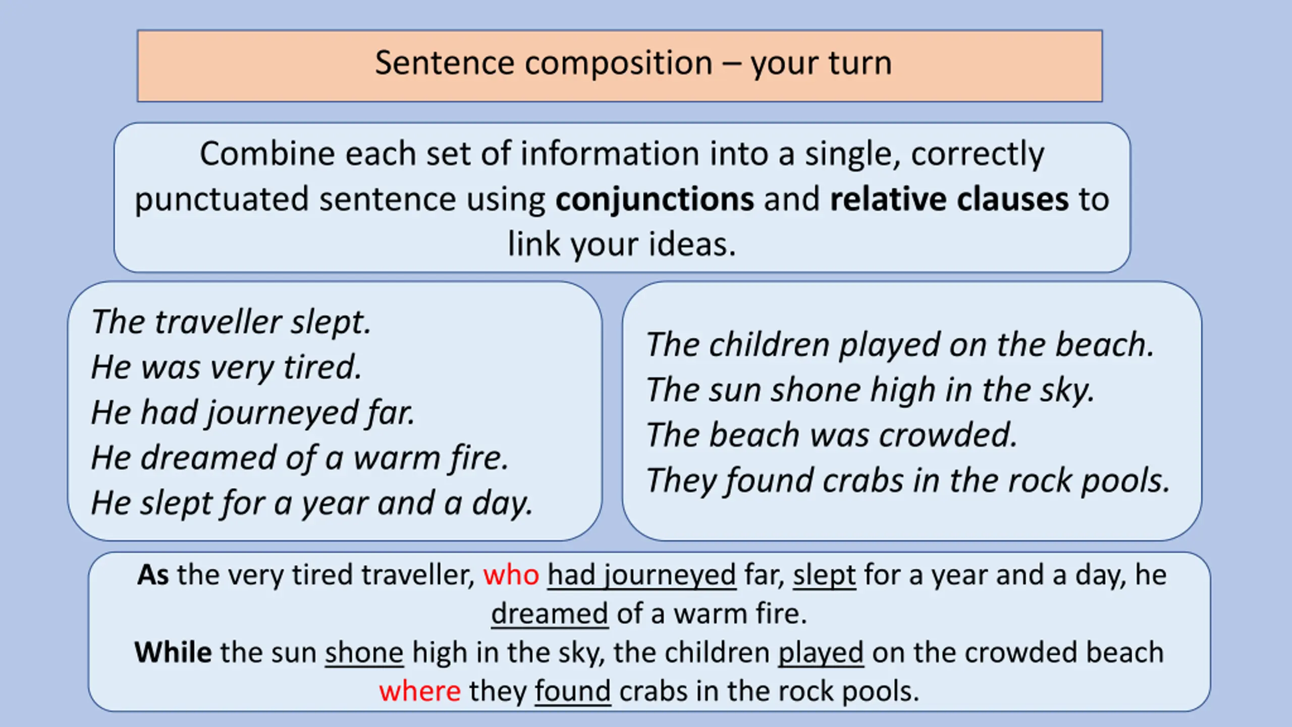 Sentence composition your turn Combine each set of information into a single, correctly punctuated sentence using conjunctions and relative clauses to link your ideas. The traveller slept. He was very tired. He had journeyed far. He dreamed of a warm fire. He slept for a year and a day. The children played on the beach. The sun shone high in the sky. The beach was crowded. They found crabs in the rock pools. As the very tired traveller, who had journeyed far, slept for a year and a day, he dreamed of a warm fire. While the sun shone high in the sky, the children played on the crowded beach where they found crabs in the rock pools.