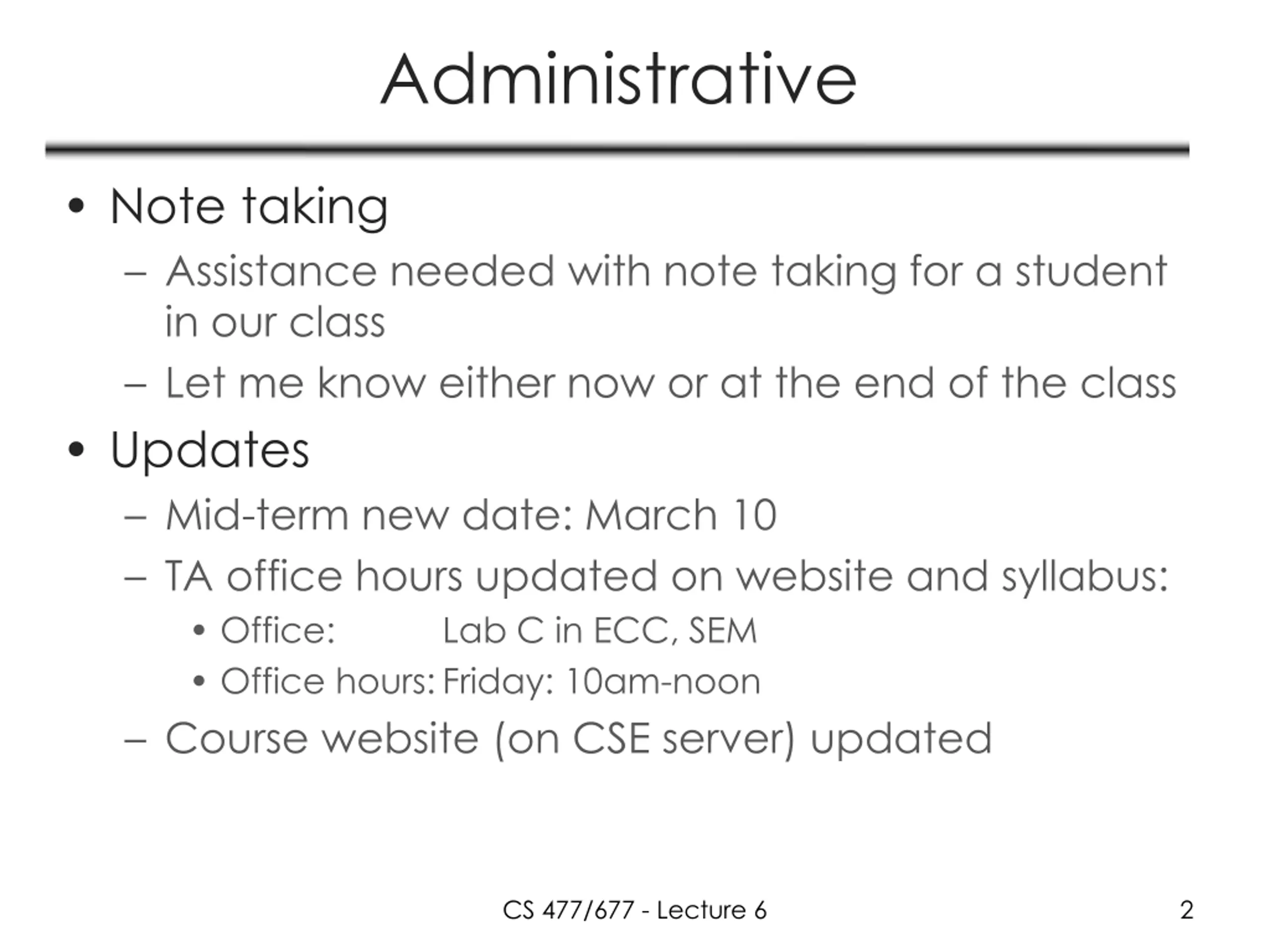 Administrative Note taking Assistance needed with note taking for a student in our class Let me know either now or at the end of the class Updates Mid-term new date: March 10 TA office hours updated on website and syllabus: Office: Lab C in ECC, SEM Office hours:Friday: 10am-noon Course website (on CSE server) updated CS 477/677 - Lecture 6 2