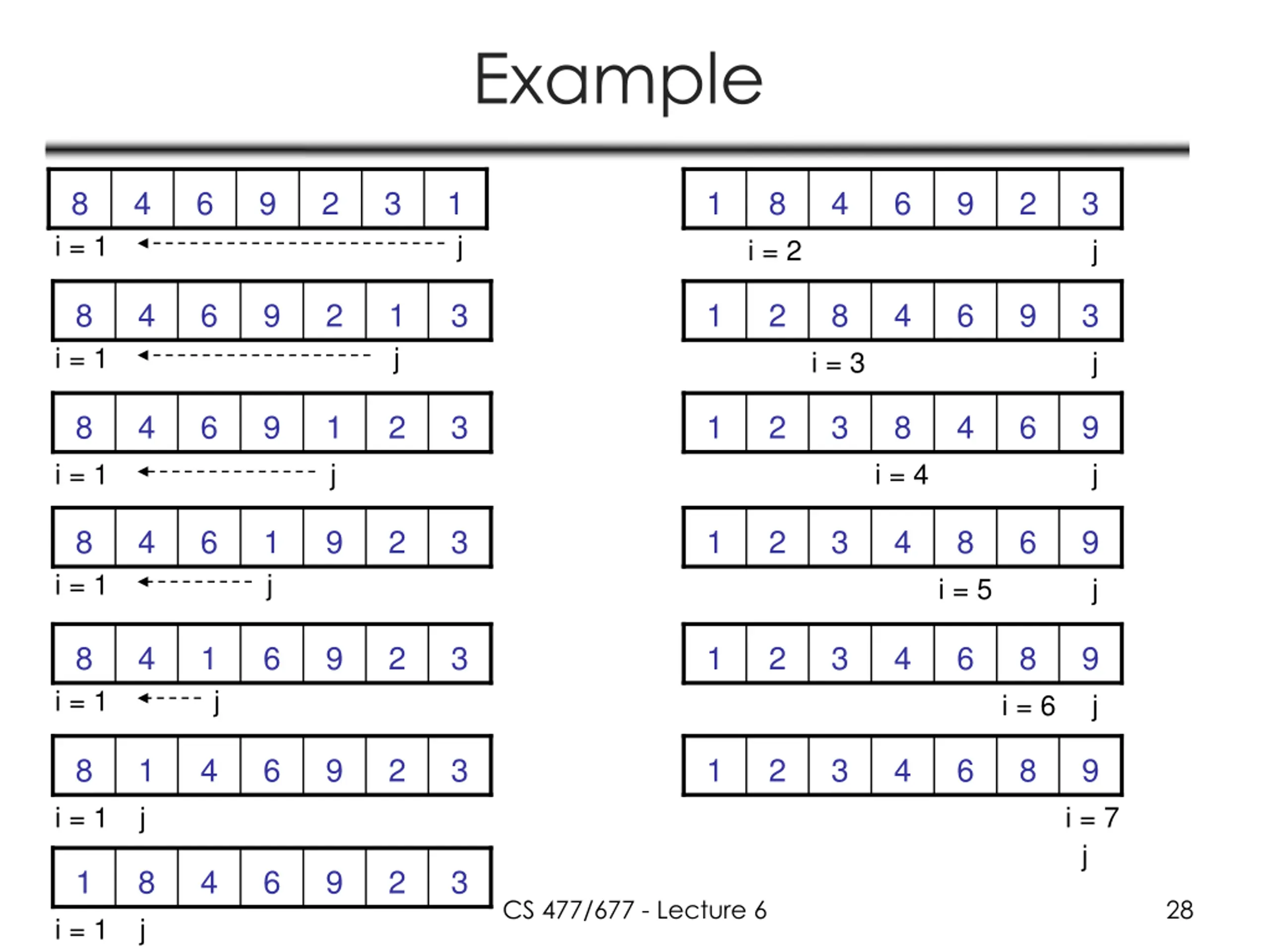 Example 8 4 6 9 2 3 1 1 8 4 6 9 2 3 i = 1 j i = 2 j 8 4 6 9 2 1 j 3 1 2 8 4 6 9 3 i = 1 i = 3 j 8 4 6 9 1 j 2 3 1 2 3 8 4 6 9 i = 1 i = 4 j 8 4 6 1 j 9 2 3 1 2 3 4 8 6 9 i = 1 i = 5 j 8 4 1 6 9 2 3 1 2 3 4 6 8 9 i = 1 j i = 6 j 8 1 j 4 6 9 2 3 1 2 3 4 6 8 9 i = 1 i = 7 j 1 8 j 4 6 9 2 3 CS 477/677 - Lecture 6 28 i = 1