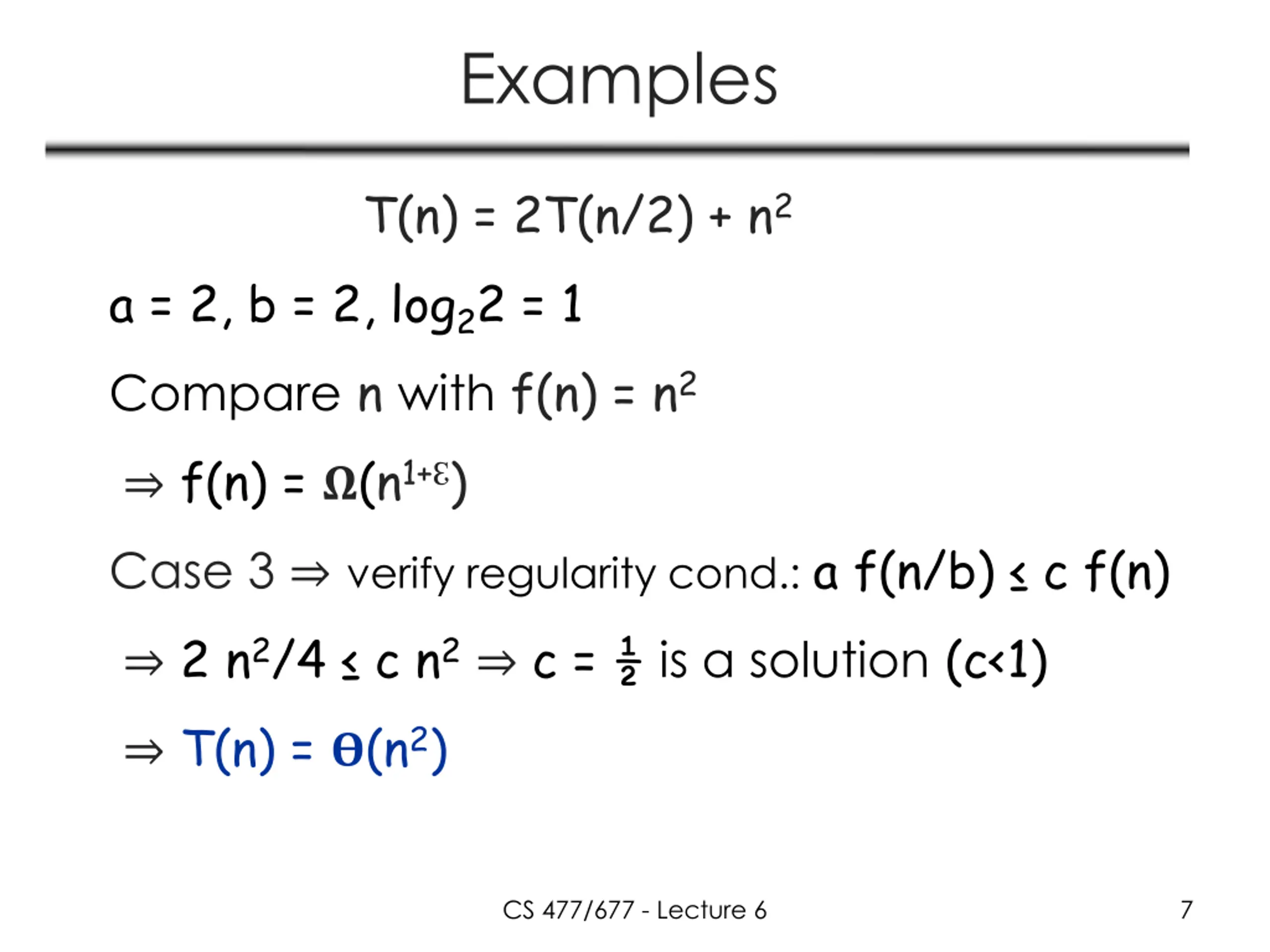 Examples T(n) = 2T(n/2) + n2 a = 2, b = 2, log22 = 1 Compare n with f(n) = n2 f(n) = ?(n1+ ) Case 3 verify regularity cond.: a f(n/b) c f(n) 2 n2/4 c n2 c = is a solution (c<1) T(n) = ?(n2) CS 477/677 - Lecture 6 7