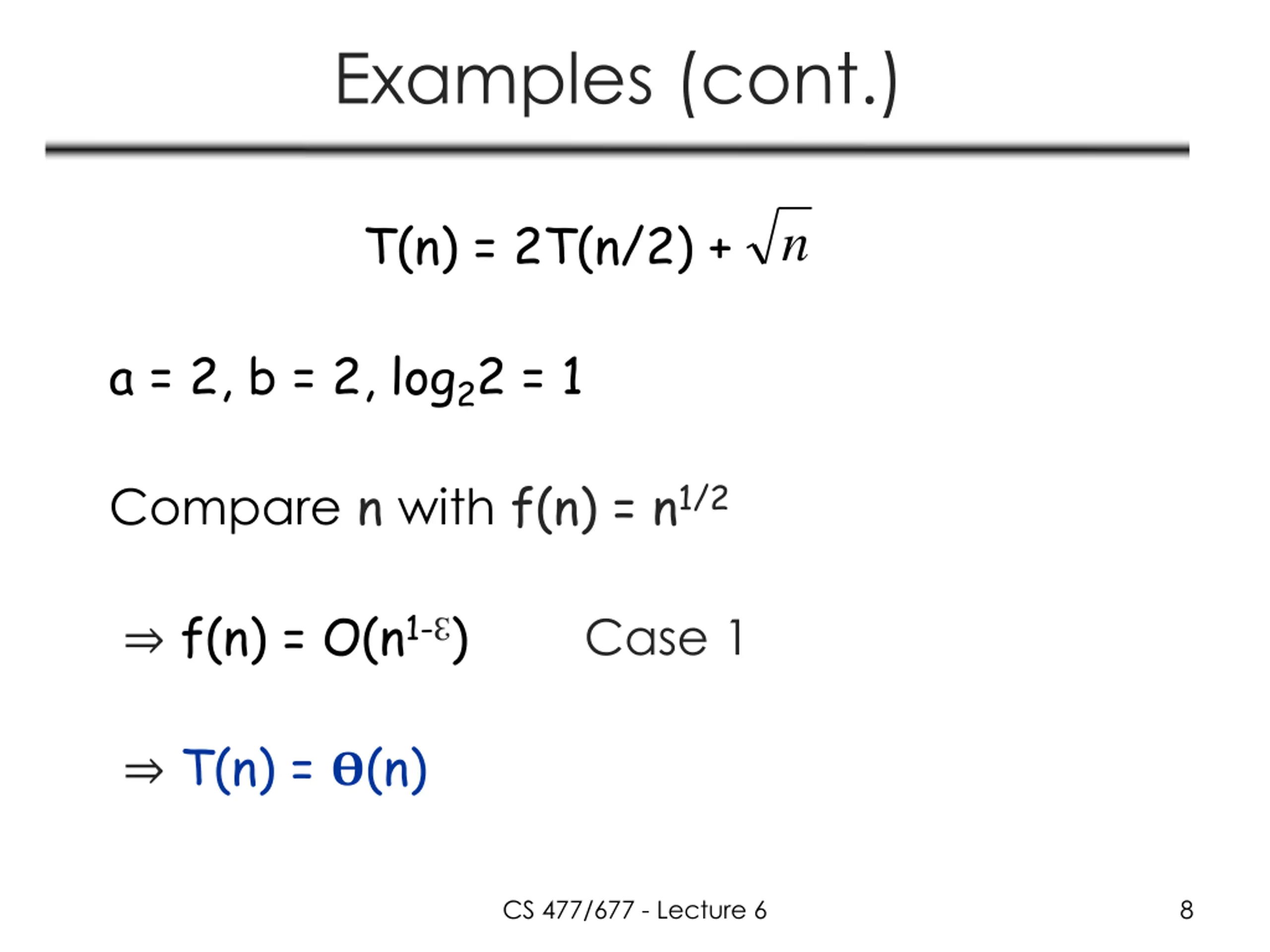 Examples (cont.) T(n) = 2T(n/2) + n a = 2, b = 2, log22 = 1 Compare n with f(n) = n1/2 f(n) = O(n1- ) Case 1 T(n) = ?(n) CS 477/677 - Lecture 6 8