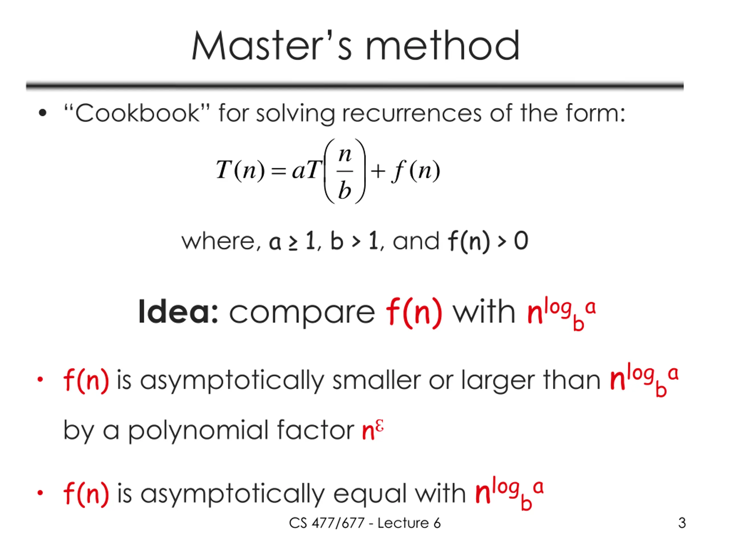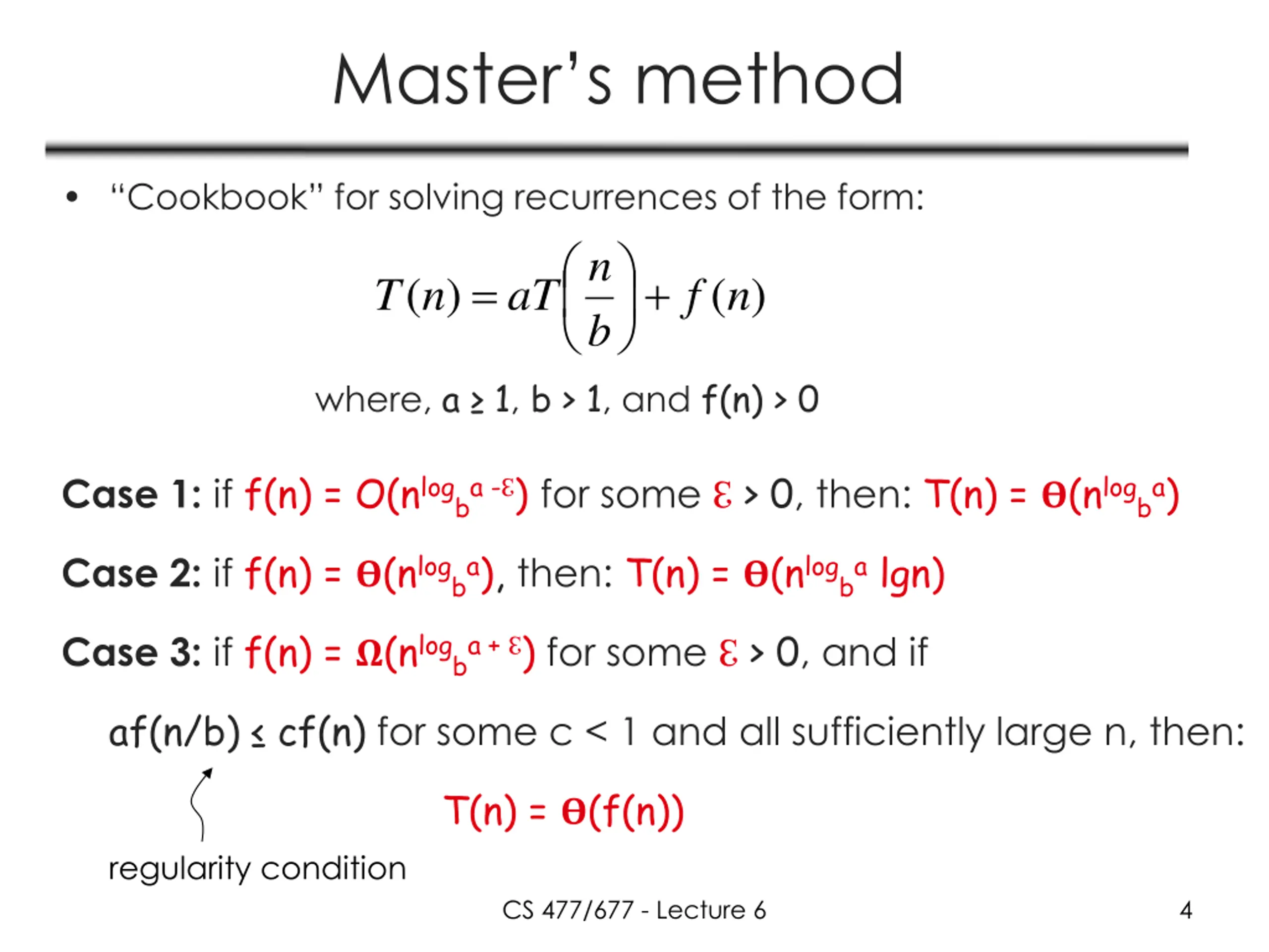 Masters method Cookbook for solving recurrences of the form: = n + ( ) ( ) T n aT f n b where, a 1, b > 1, and f(n) > 0 Idea: compare f(n) with nlogba f(n) is asymptotically smaller or larger than nlogba by a polynomial factor n f(n) is asymptotically equal with nlogba CS 477/677 - Lecture 6 3