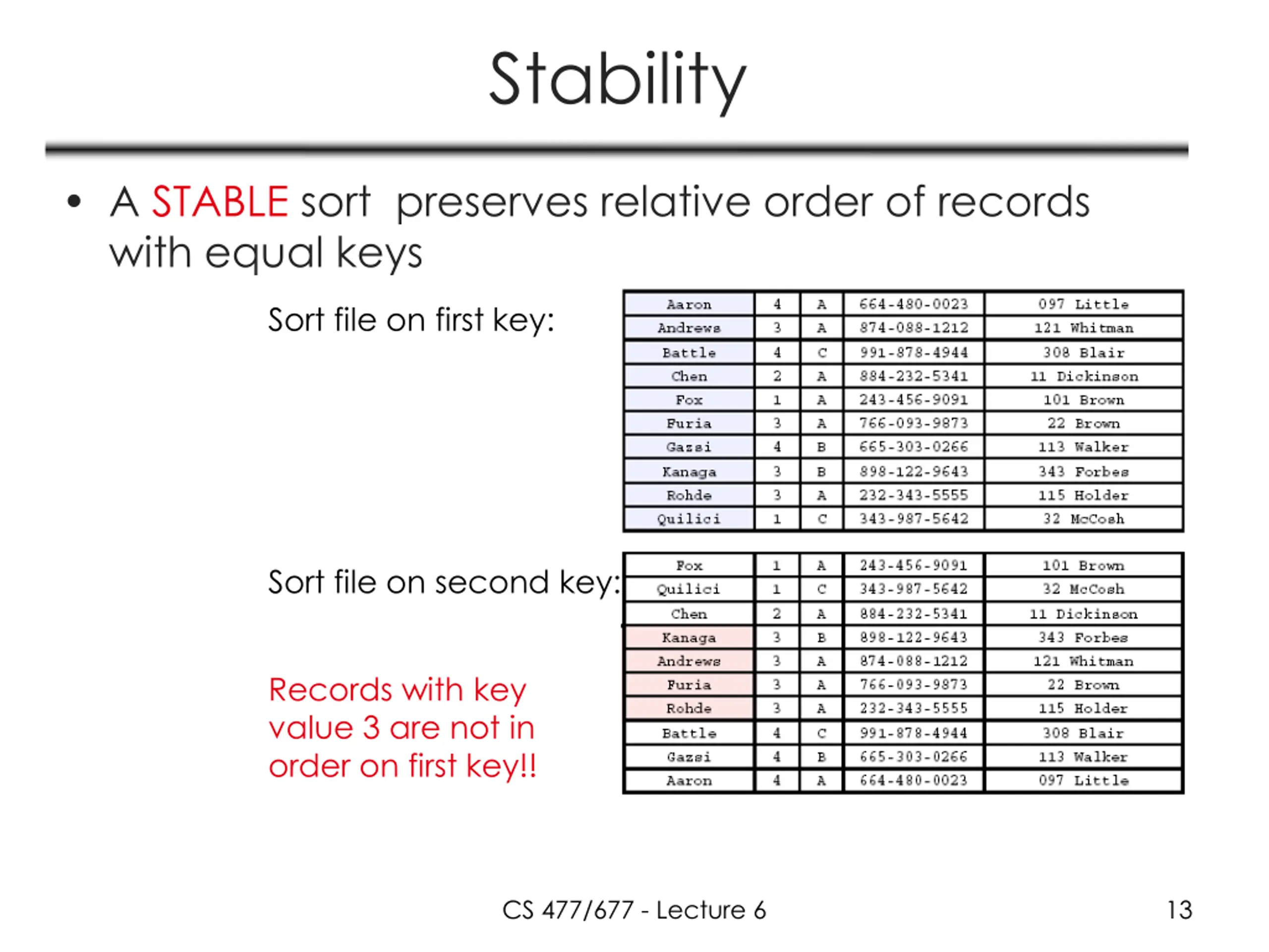 Stability A STABLE sort preserves relative order of records with equal keys Sort file on first key: Sort file on second key: Records with key value 3 are not in order on first key!! CS 477/677 - Lecture 6 13