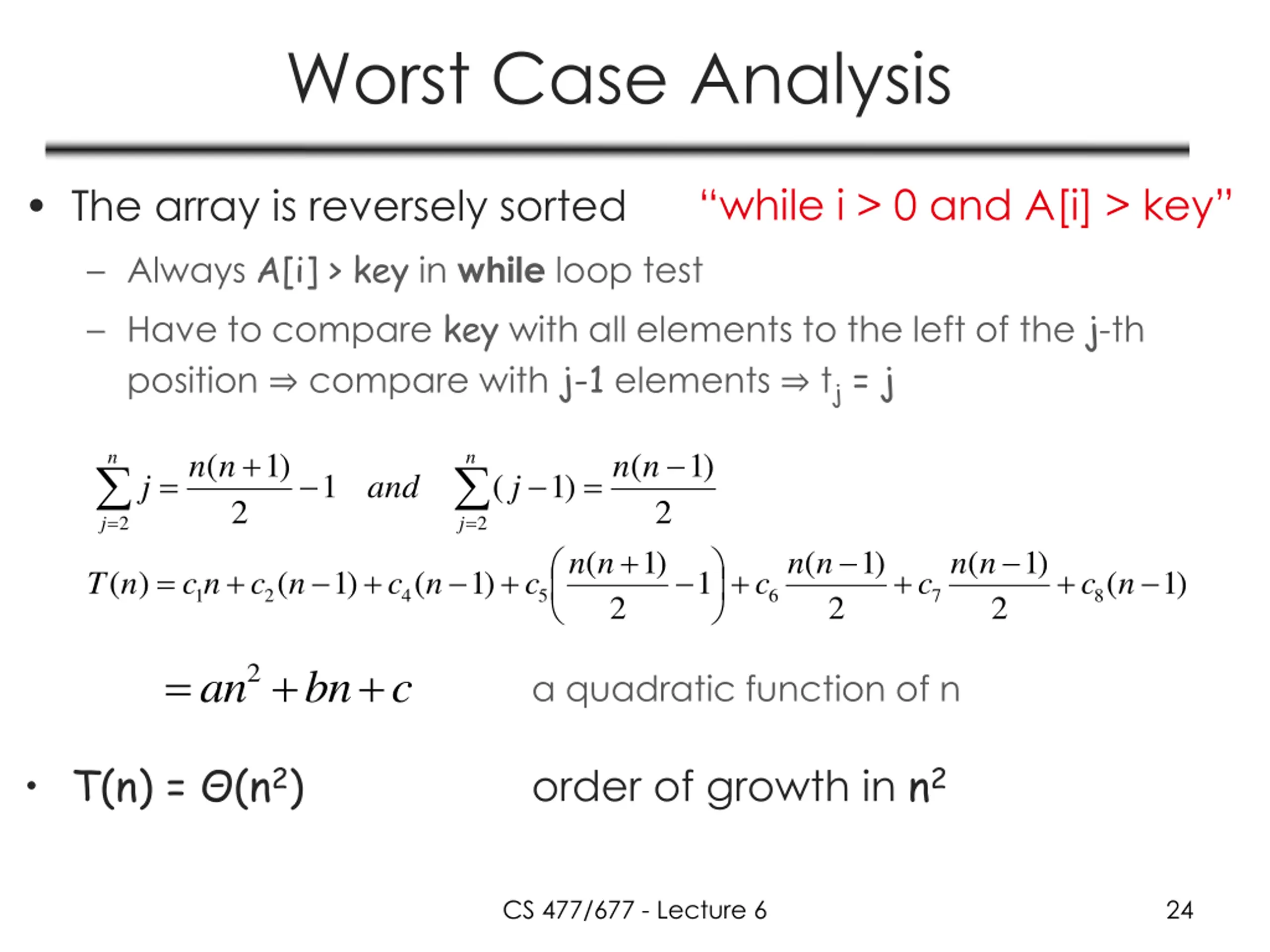 Worst Case Analysis while i > 0 and A[i] > key The array is reversely sorted Always A[i] > key in while loop test Have to compare keywith all elements to the left of the j-th position compare with j-1 elements tj = j ) 1 + ) 1 n n ( ( n n n n = j = j = ) 1 = 1 ( j and j 2 2 2 2 ) 1 + ) 1 ) 1 ( ( ( n n n n n n = + ) 1 + ) 1 + + + + ) 1 ( ) ( ( 1 ( T n c n c n c n c c c c n 1 2 4 5 6 7 8 2 2 2 = + + 2 an bn c a quadratic function of n T(n) = (n2) order of growth in n2 CS 477/677 - Lecture 6 24