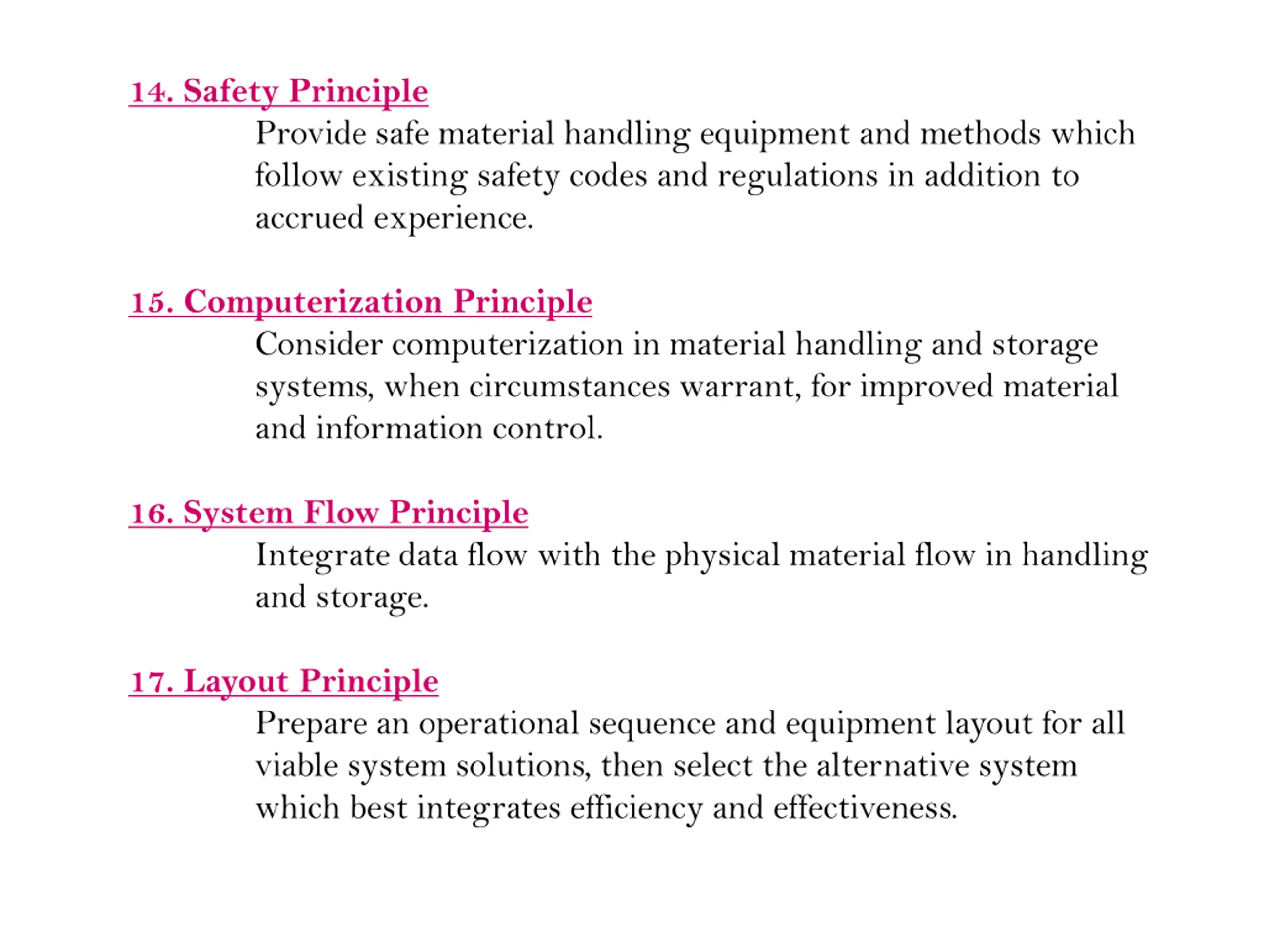 14. Safety Principle Provide safe material handling equipment and methods which follow existing safety codes and regulations in addition to accrued experience. 15. Computerization Principle Consider computerization in material handling and storage systems, when circumstances warrant, for improved material and information control. 16. System Flow Principle Integrate data flow with the physical material flow in handling and storage. 17. Layout Principle Prepare an operational sequence and equipment layout for all viable system solutions, then select the alternative system which best integrates efficiency and effectiveness.