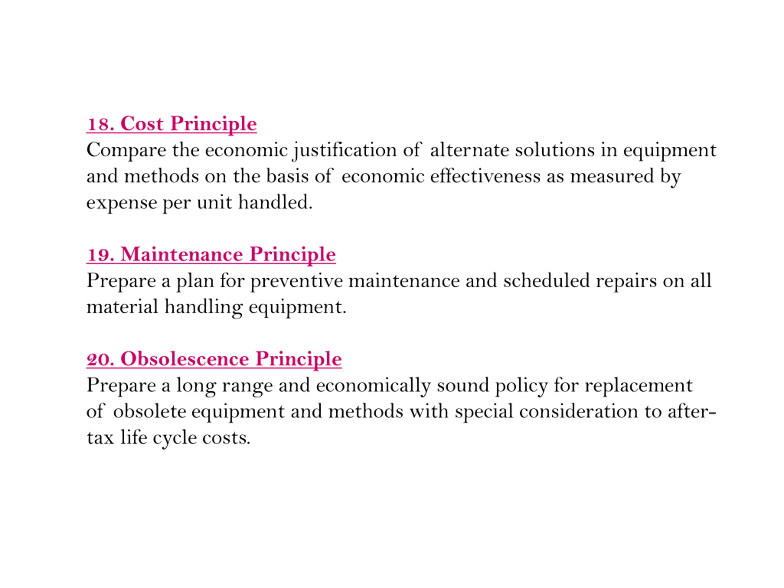 18. Cost Principle Compare the economic justification of alternate solutions in equipment and methods on the basis of economic effectiveness as measured by expense per unit handled. 19. Maintenance Principle Prepare a plan for preventive maintenance and scheduled repairs on all material handling equipment. 20. Obsolescence Principle Prepare a long range and economically sound policy for replacement of obsolete equipment and methods with special consideration to after- tax life cycle costs.