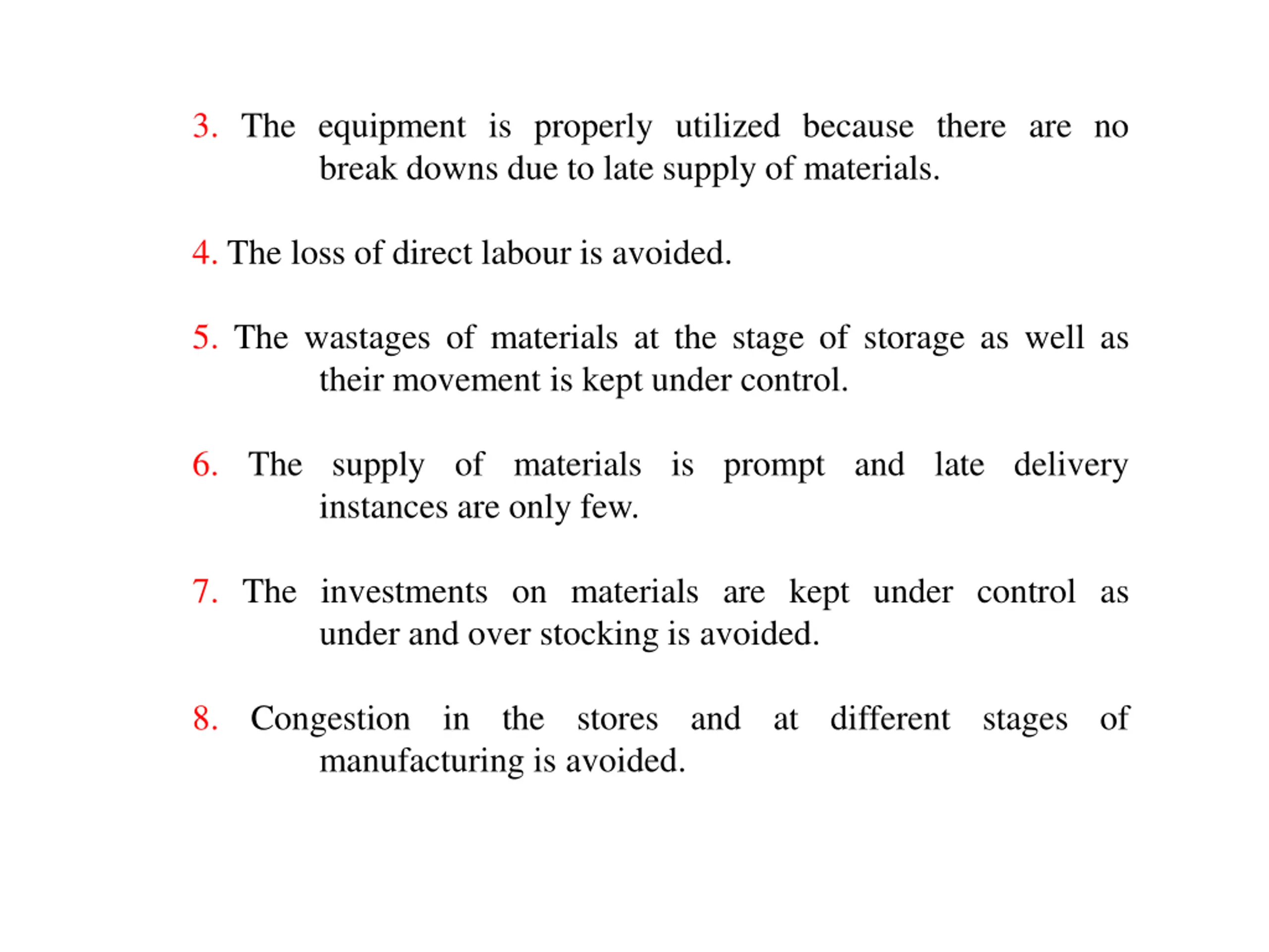 3. The equipment is properly utilized because there are no break downs due to late supply of materials. 4. The loss of direct labour is avoided. 5. The wastages of materials at the stage of storage as well as their movement is kept under control. 6. The supply of materials is prompt and late delivery instances are only few. 7. The investments on materials are kept under control as under and over stocking is avoided. 8. Congestion in the stores and at different stages of manufacturing is avoided.