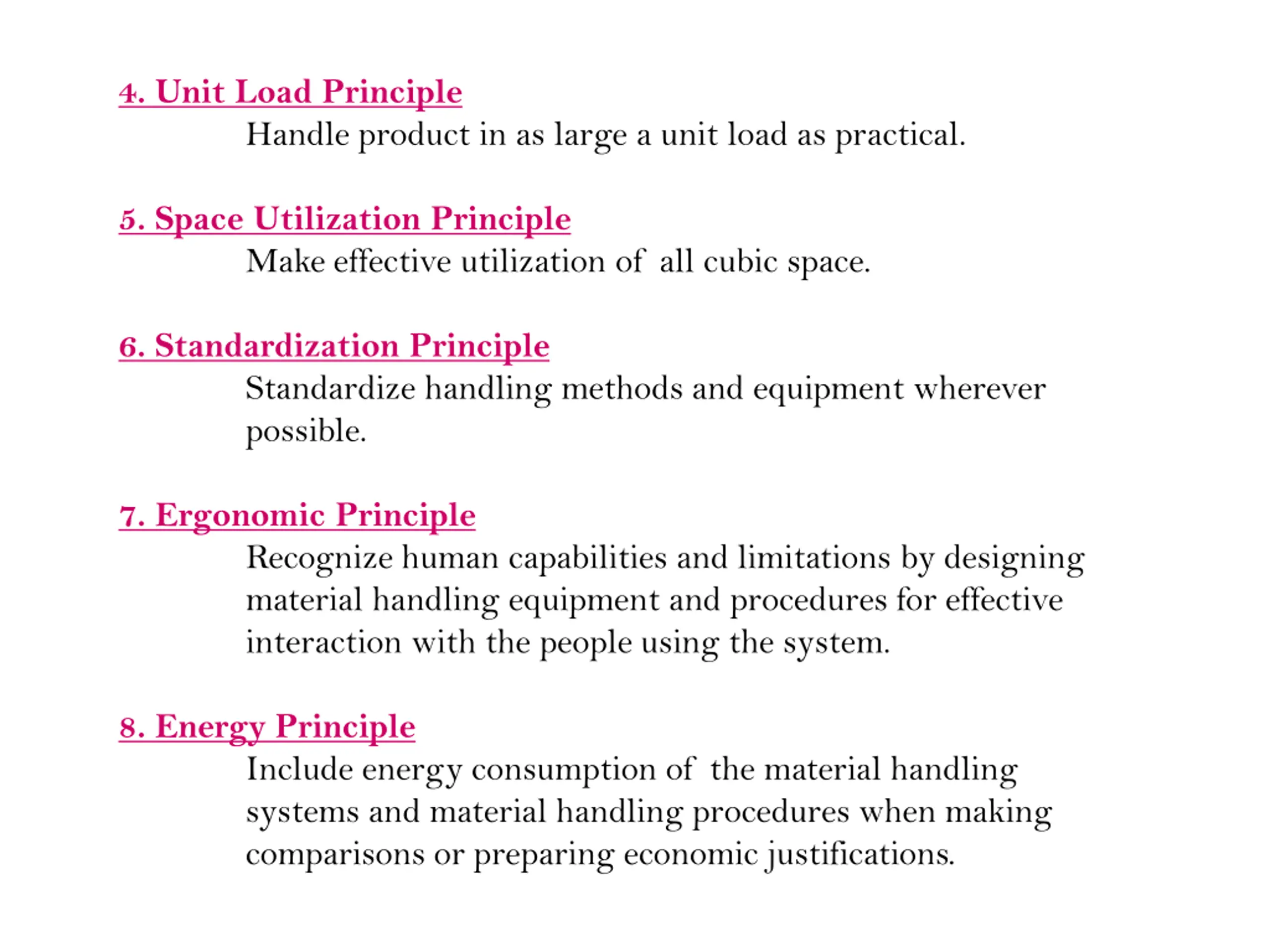4. Unit Load Principle Handle product in as large a unit load as practical. 5. Space Utilization Principle Make effective utilization of all cubic space. 6. Standardization Principle Standardize handling methods and equipment wherever possible. 7. Ergonomic Principle Recognize human capabilities and limitations by designing material handling equipment and procedures for effective interaction with the people using the system. 8. Energy Principle Include energy consumption of the material handling systems and material handling procedures when making comparisons or preparing economic justifications.