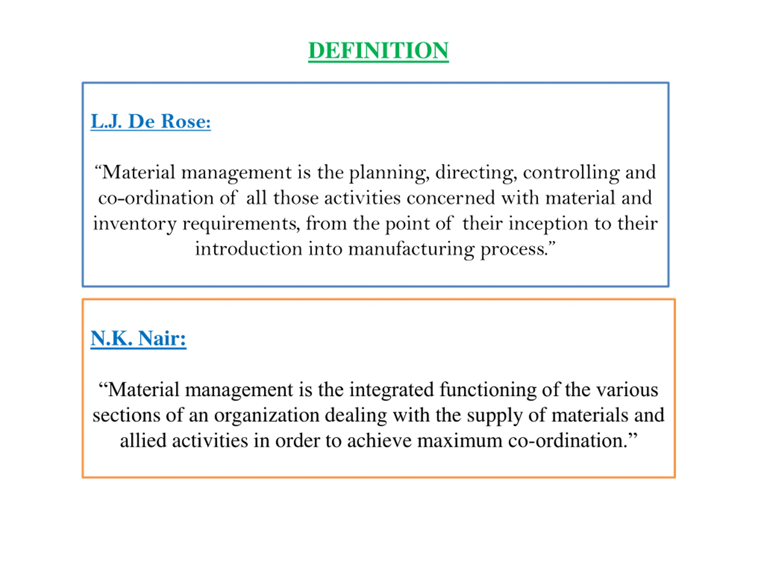 DEFINITION L.J. De Rose: Material management is the planning, directing, controlling and co-ordination of all those activities concerned with material and inventory requirements, from the point of their inception to their introduction into manufacturing process. N.K. Nair: Material management is the integrated functioning of the various sections of an organization dealing with the supply of materials and allied activities in order to achieve maximum co-ordination.