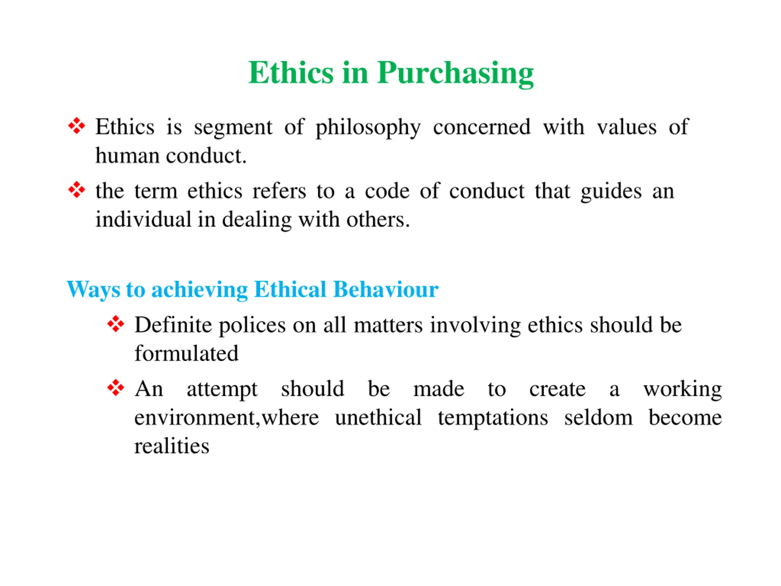 Ethics in Purchasing Ethics is segment of philosophy concerned with values of human conduct. the term ethics refers to a code of conduct that guides an individual in dealing with others. Ways to achieving Ethical Behaviour Definite polices on all matters involving ethics should be formulated An attempt should be environment,where unethical temptations seldom become realities made to create a working