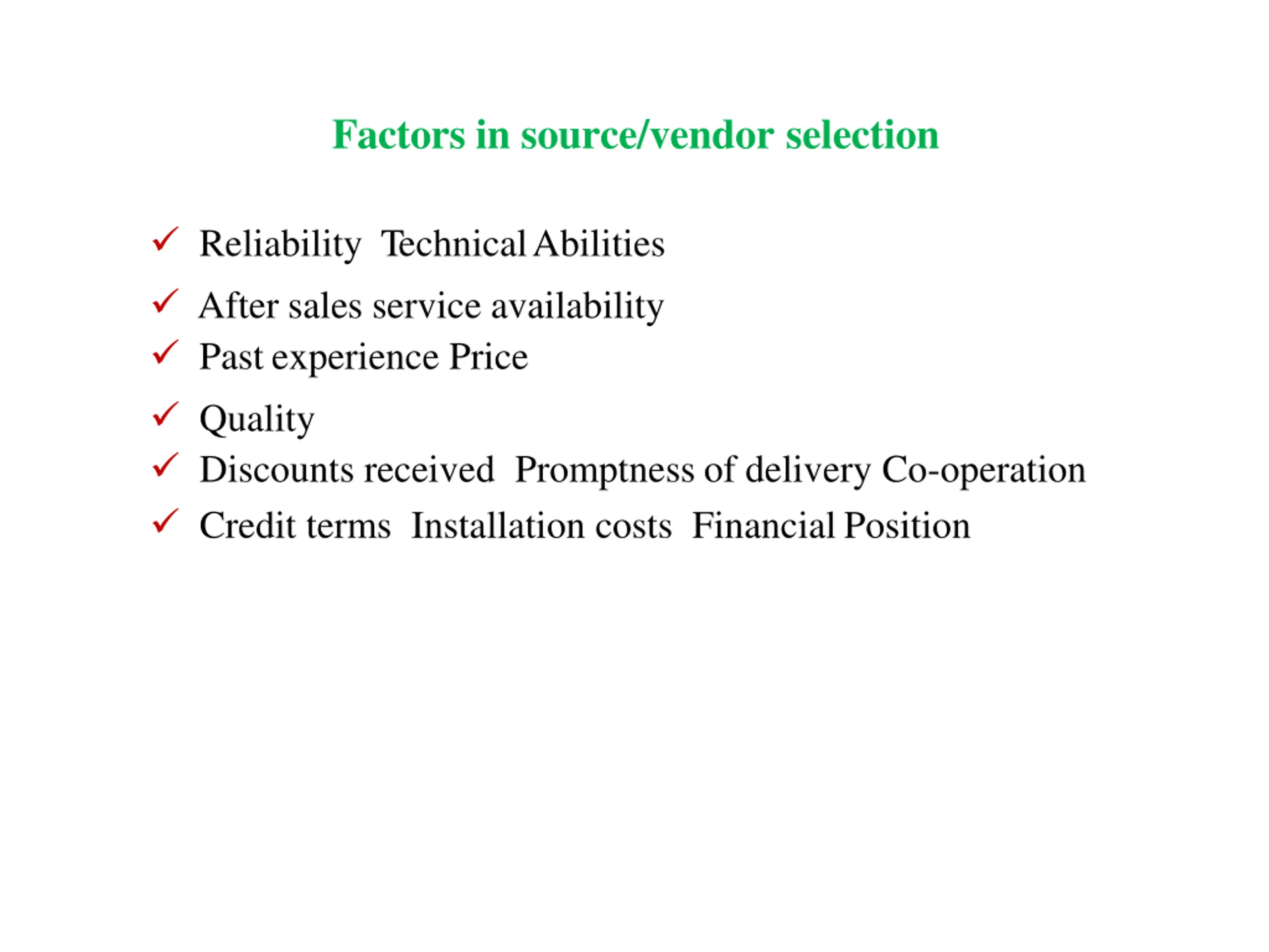 Factors in source/vendor selection Reliability TechnicalAbilities After sales service availability Past experience Price Quality Discounts received Promptness of delivery Co-operation Credit terms Installation costs Financial Position