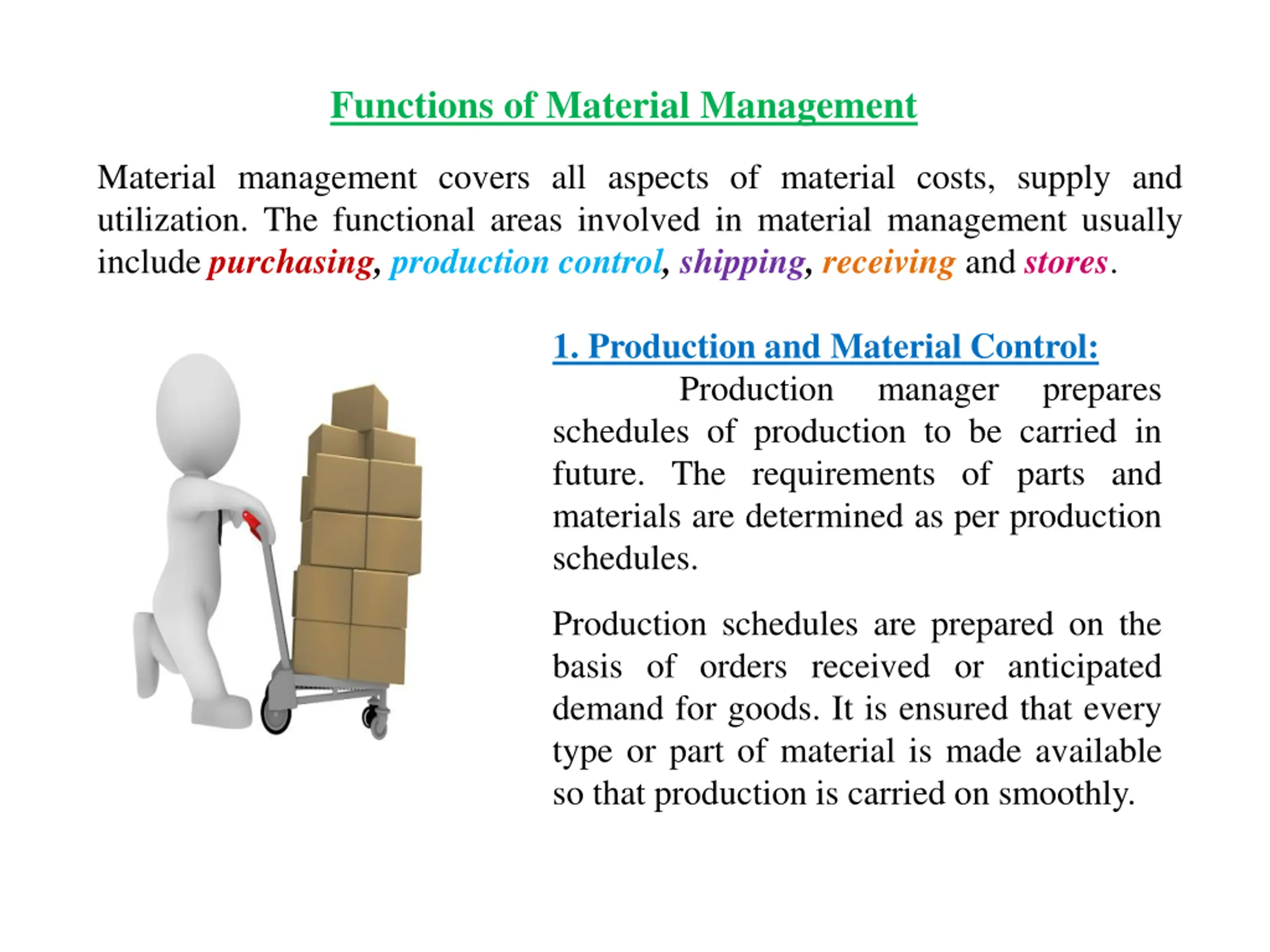 Functions of Material Management Material management covers all aspects of material costs, supply and utilization. The functional areas involved in material management usually include purchasing, production control, shipping, receivingand stores. 1. Production and Material Control: Production schedules of production to be carried in future. The requirements of parts and materials are determined as per production schedules. manager prepares Production schedules are prepared on the basis of orders received or anticipated demand for goods. It is ensured that every type or part of material is made available so that production is carried on smoothly.