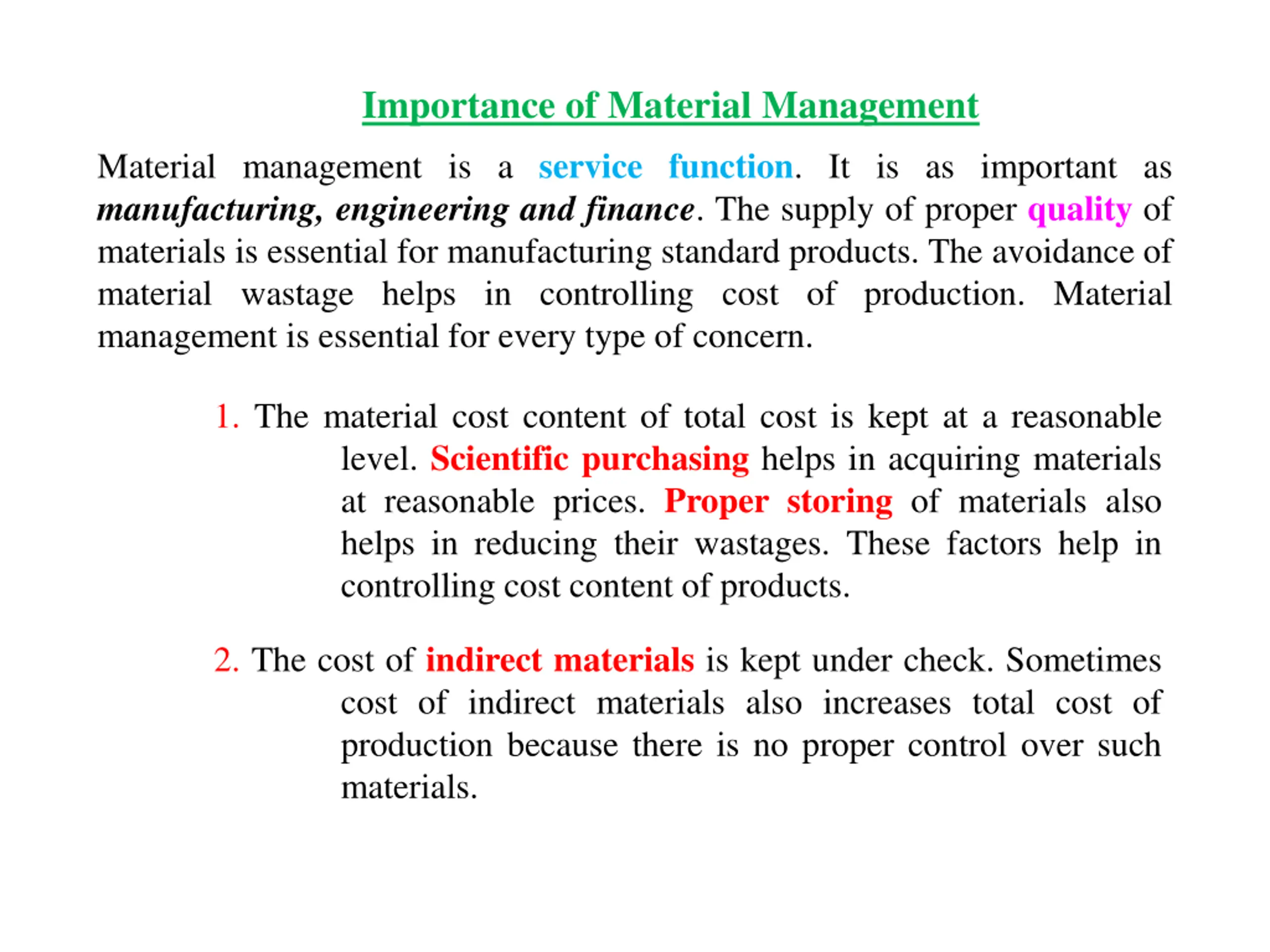 Importance of Material Management Material management is a service function. It is as important as manufacturing, engineering and finance. The supply of proper quality of materials is essential for manufacturing standard products. The avoidance of material wastage helps in controlling cost of production. Material management is essential for every type of concern. 1. The material cost content of total cost is kept at a reasonable level. Scientific purchasing helps in acquiring materials at reasonable prices. Proper storing of materials also helps in reducing their wastages. These factors help in controlling cost content of products. 2. The cost of indirect materials is kept under check. Sometimes cost of indirect materials also increases total cost of production because there is no proper control over such materials.