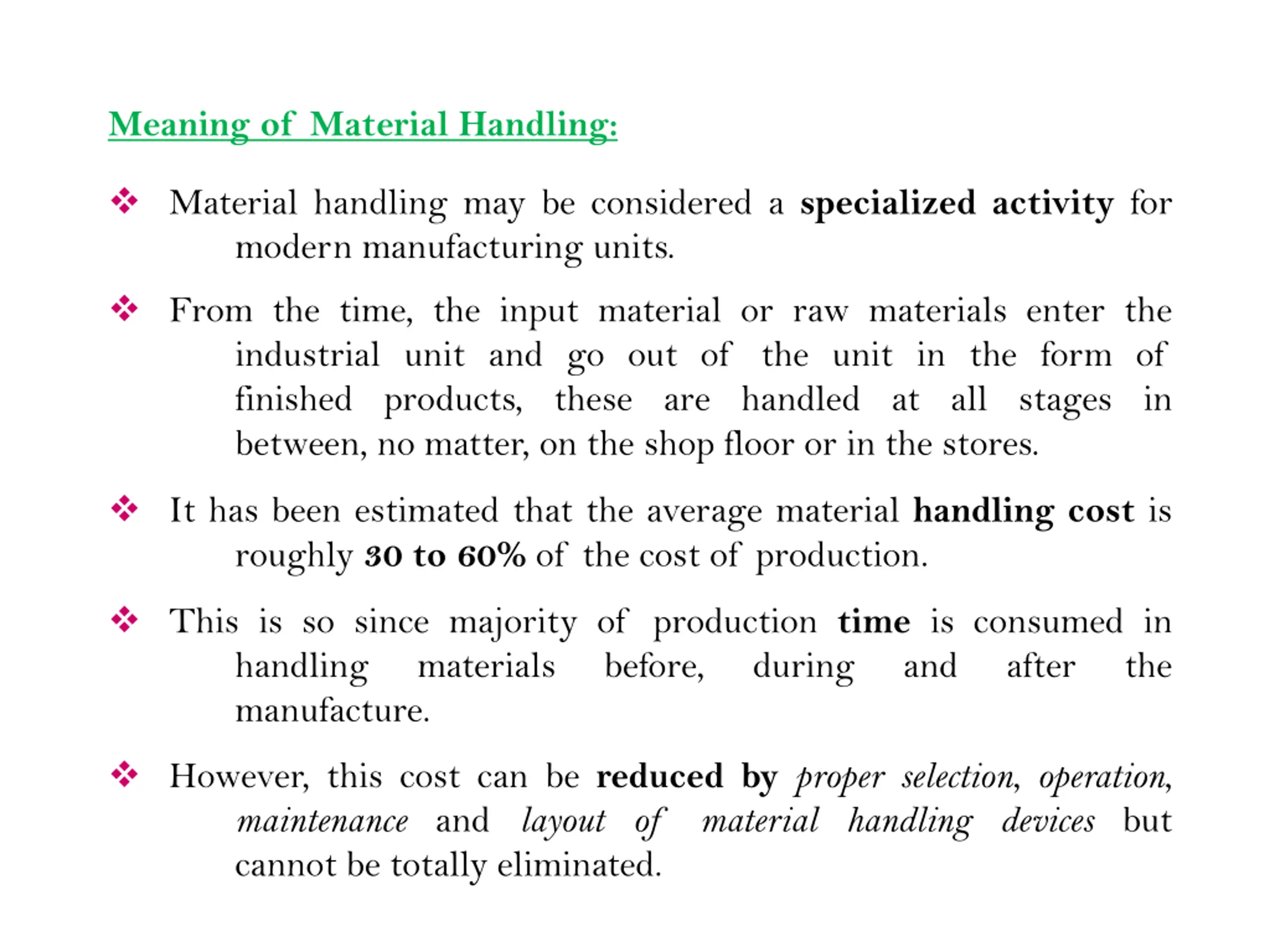Meaning of Material Handling: Material handling may be considered a specialized activity for modern manufacturing units. From the time, the input material or raw materials enter the industrial unit and go out of the unit in the form of finished products, these are handled at all stages in between, no matter, on the shop floor or in the stores. It has been estimated that the average material handling cost is roughly 30 to 60% of the cost of production. This is so since majority of production time is consumed in handling materials before, manufacture. during and after the However, this cost can be reduced byproper selection, operation, maintenance and layout of material handling devices but cannot be totally eliminated.