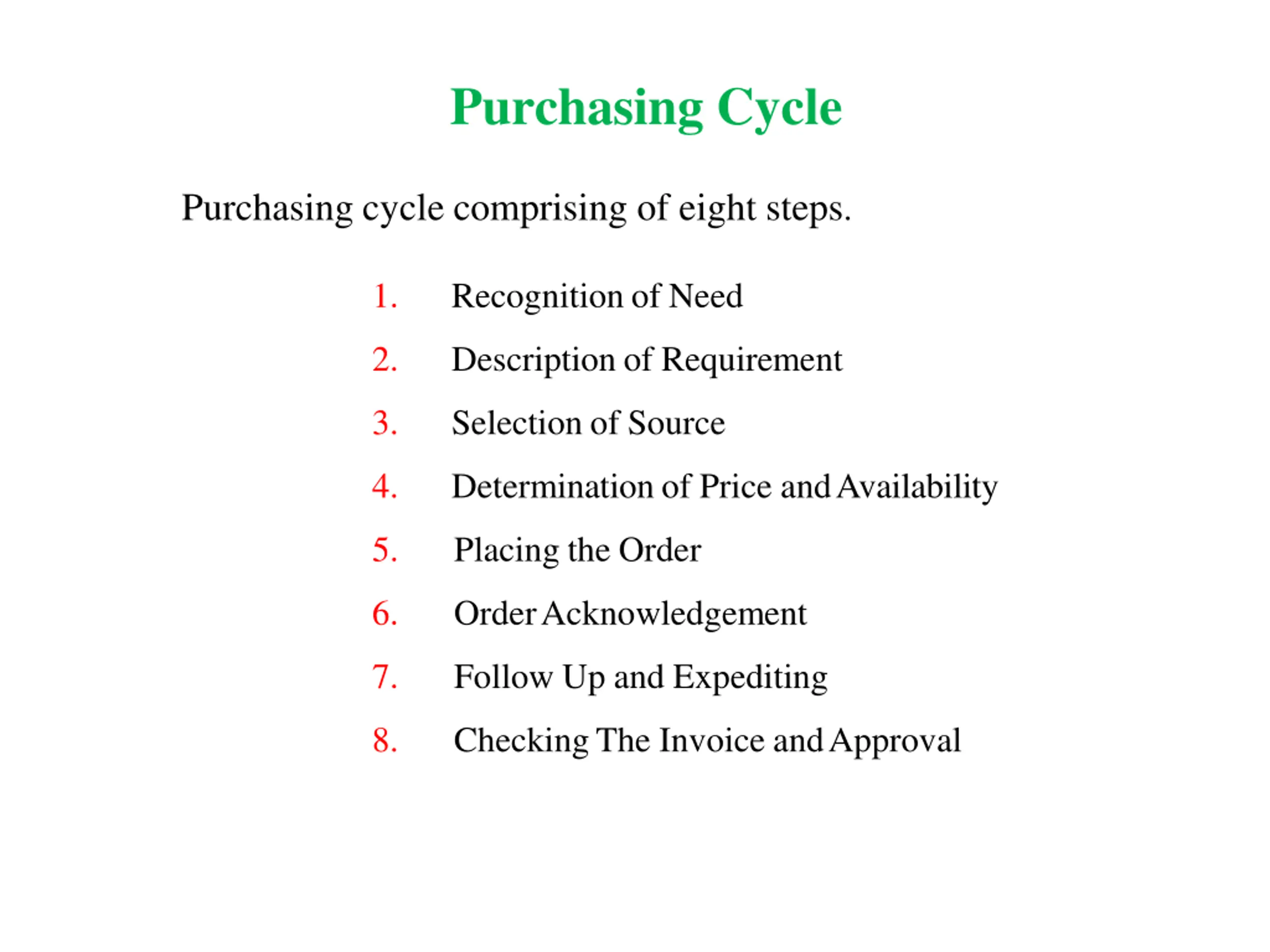 Purchasing Cycle Purchasing cycle comprising of eight steps. 1. Recognition of Need 2. Description of Requirement 3. Selection of Source 4. Determination of Price andAvailability 5. Placing the Order 6. OrderAcknowledgement 7. Follow Up and Expediting 8. CheckingThe Invoice andApproval